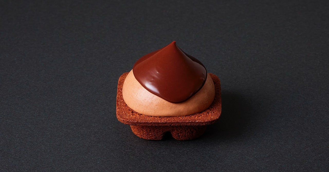上掛けのチョコレートやムースに風味を合わせ、ハイカカオのクーベルチュールチョコレートを混ぜ込んでいます。