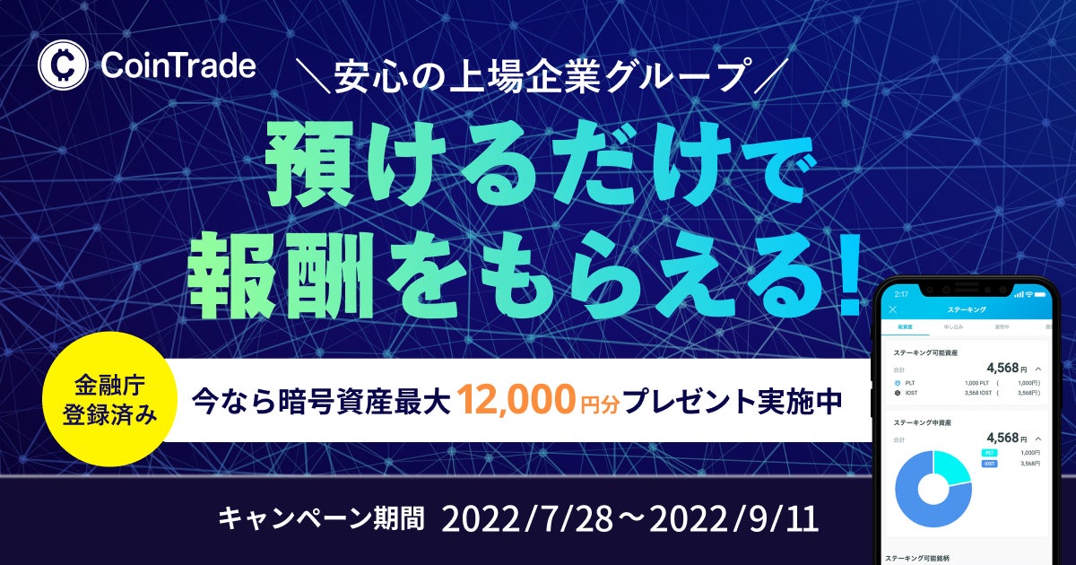 また、コイントレードではステーキングサービス開始を記念して、PLTとIOSTの3万円以上の取引かつステーキングのお申込みで、対象者全員に3,000円相当の暗号資産をプレゼントするキャンペーンを開始いたします。