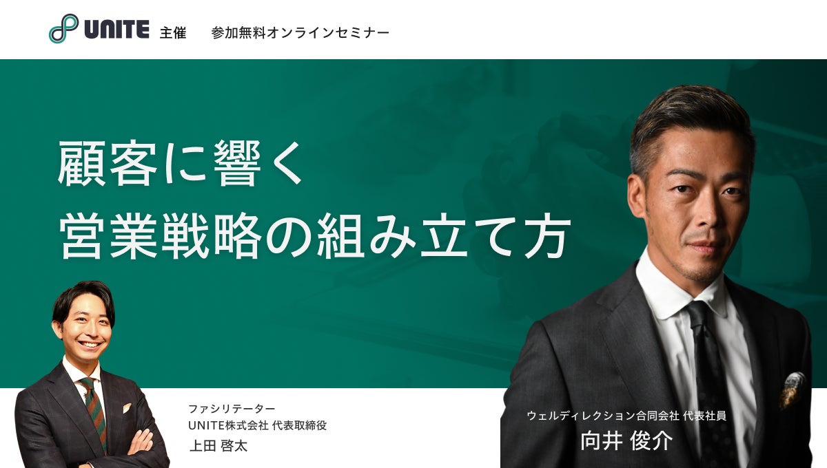 UNITE BDRプランのリリースを記念し、ウェルディレクション合同会社 代表社員の向井俊介氏を招いてオンラインセミナーのアーカイブ動画を公開いたします。本セミナーでは、「顧客に響く 営業戦略の組み立て方」というテーマで、狙った顧客にどう自社サービスを届けるのか、営業戦略ノウハウをお伝えしております。参加者の満足度100%と好評いただいたセミナーですので、「自社サービスが広がらない、売り上げが伸び悩んでいる、新しい市場の開拓方法がわからない。」といった方はぜひご視聴ください。