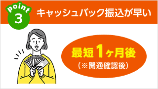 キャッシュバックが早い!なんと最短1ヶ月後には、指定の口座へ現金をお振込致します。当社が選ばれる大きな理由の1つです。