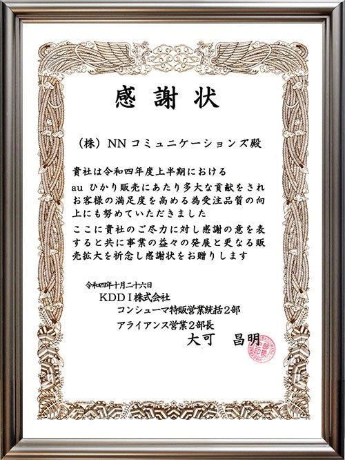 NEW! 【15期連続表彰】KDDIより感謝状を受賞