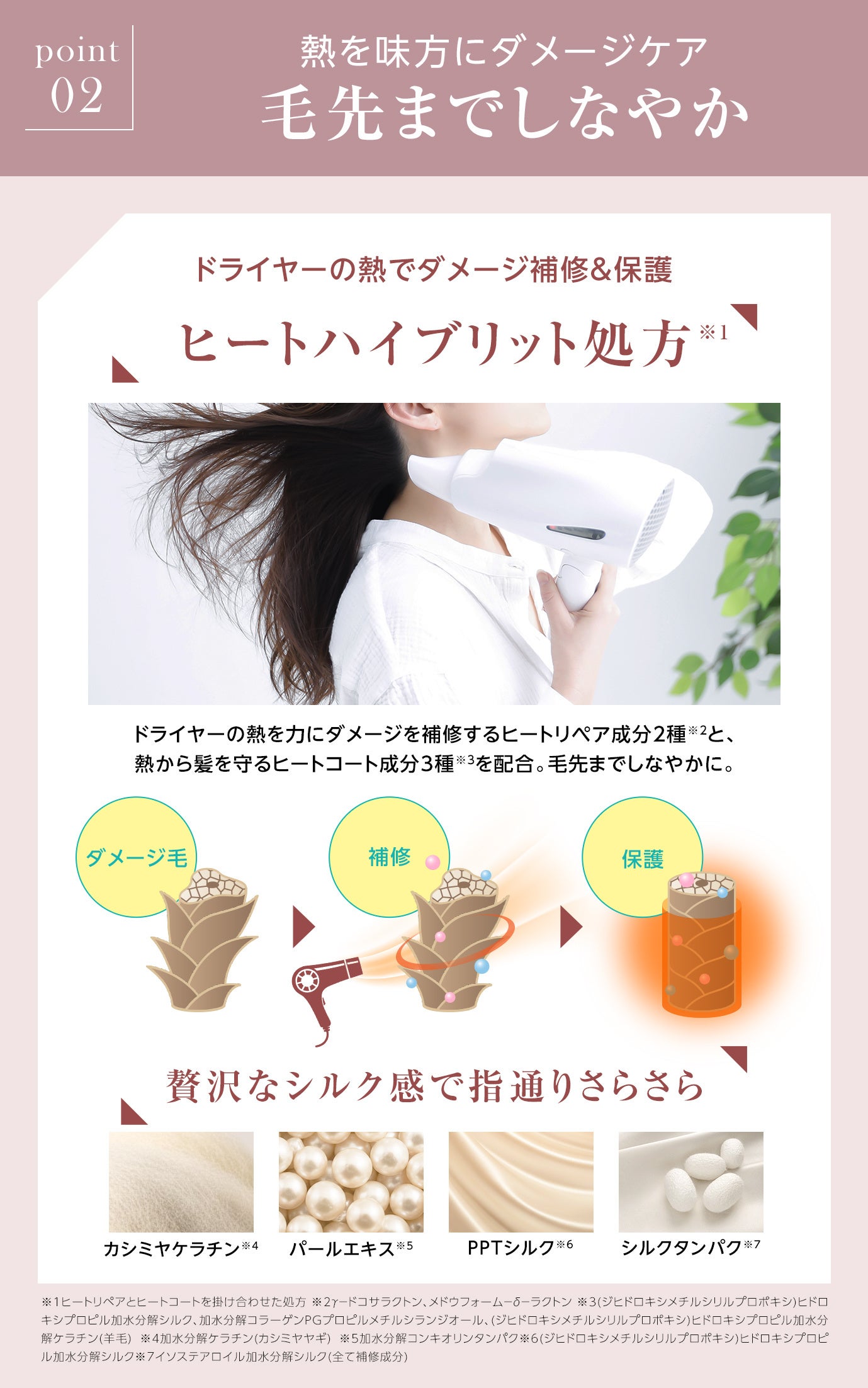 髪の芯まで補修し、パサつきをケア。うるおいサラサラ髪へ。