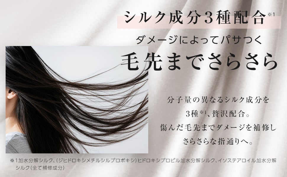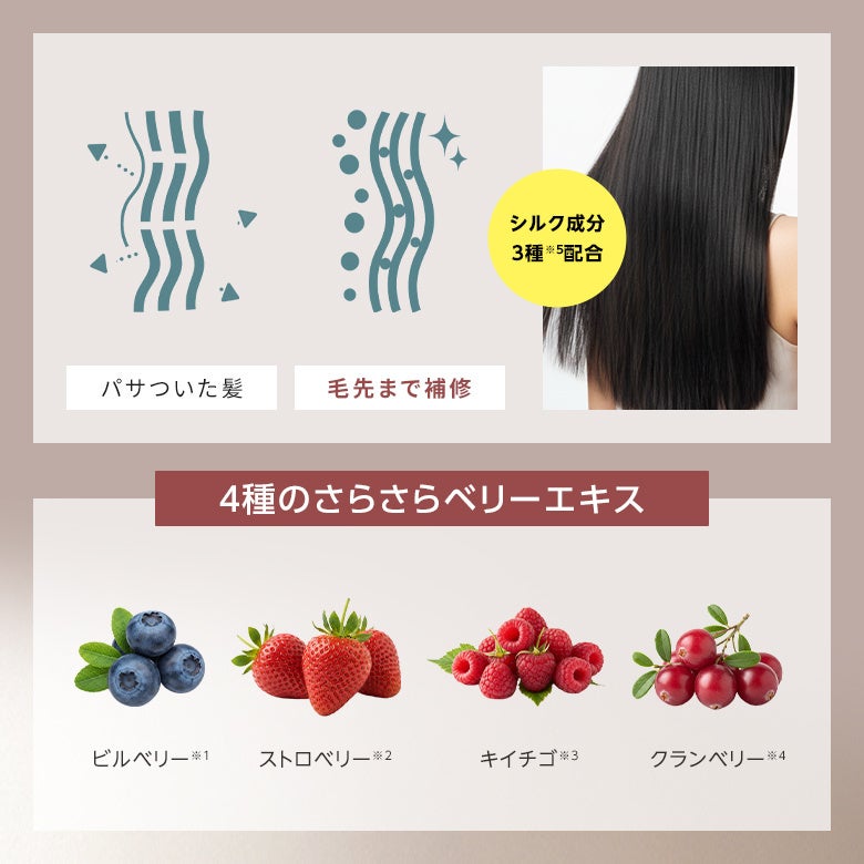 ※1ビルベリー葉エキス※2オニイチゴ根エキス※3 ヨーロッパキイチゴ果実エキス※4 クランベリー果実エキス※5 イソステアロイル加水分解シルク、(ジヒドロキシメチルシリルプロポキシ)ヒドロキシプロピル加水分解シルク、加水分解シルク(全て補修成分)