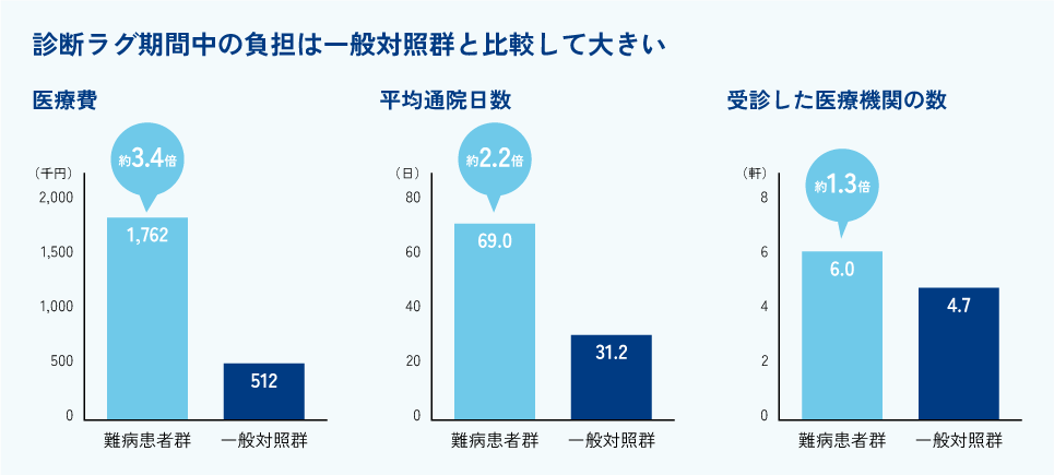 希少疾患患者の医療費は一般対照群と比較して約3.4倍、通院日数は約2.2倍に達する※1