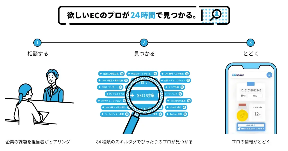 「ECのプロ」を運営しており、2,000名を超えるECのプロ登録者を、それぞれ90種類のスキルタグに細分化し、実績や強みを可視化。採用市場では見つからないECの専門家を必要な時に必要な分だけマッチングすることができるサービスを提供しています。