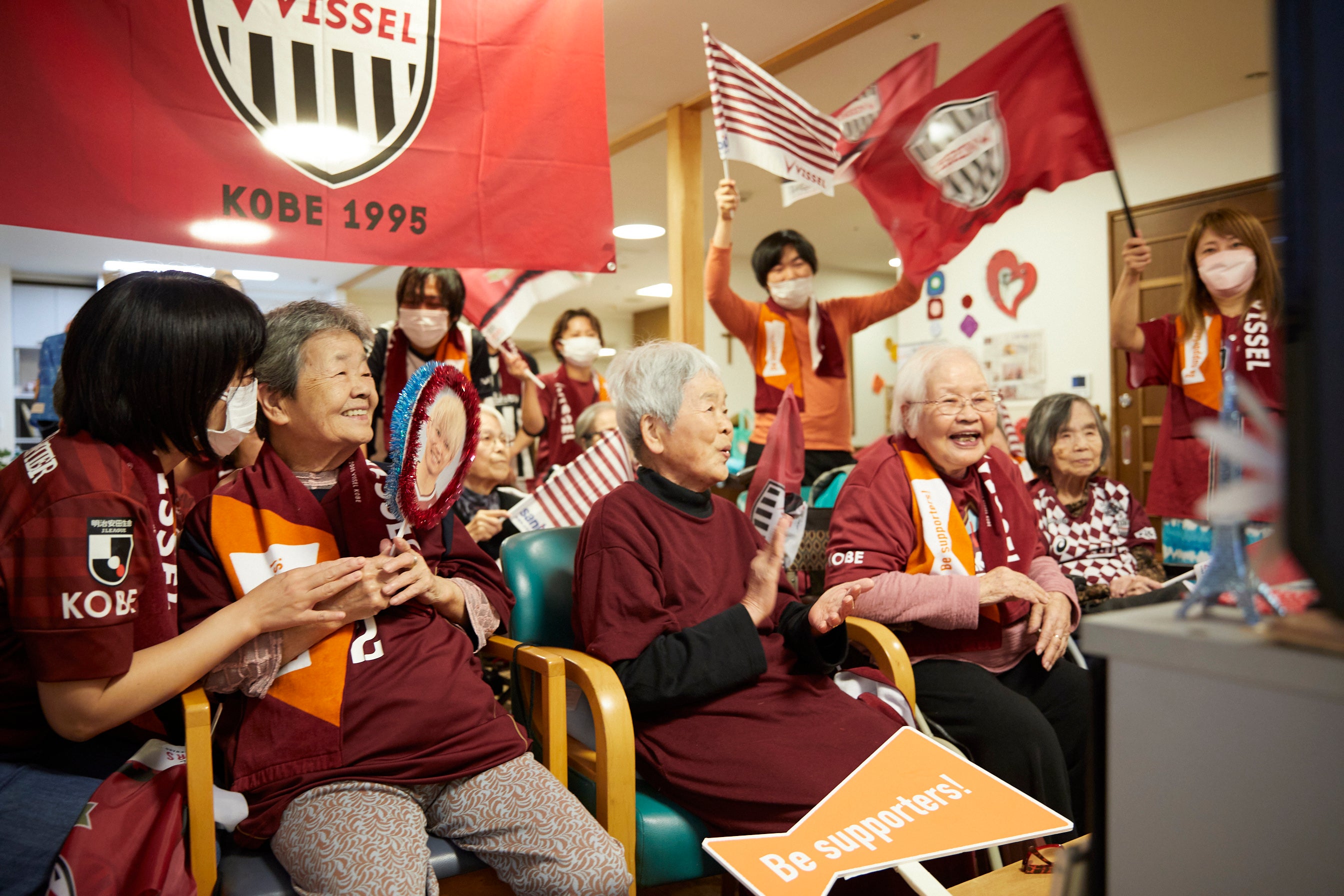 「Be supporters!」は高齢者施設の利用者や認知症の方など、普段は周囲に「支えられる」場面の多い方が、地元のJリーグのクラブの”サポーター“になることで、「支える」存在になることを目指す活動で、サントリーウエルネス(株)とJリーグが共同で推進しています。「いくつになってもワクワクしたい、すべての人へ」をコンセプトとしており、活動が始まった2020年12月から2024年12月までの参加者は、全国約230施設・延べ約1万人に広がっています。
