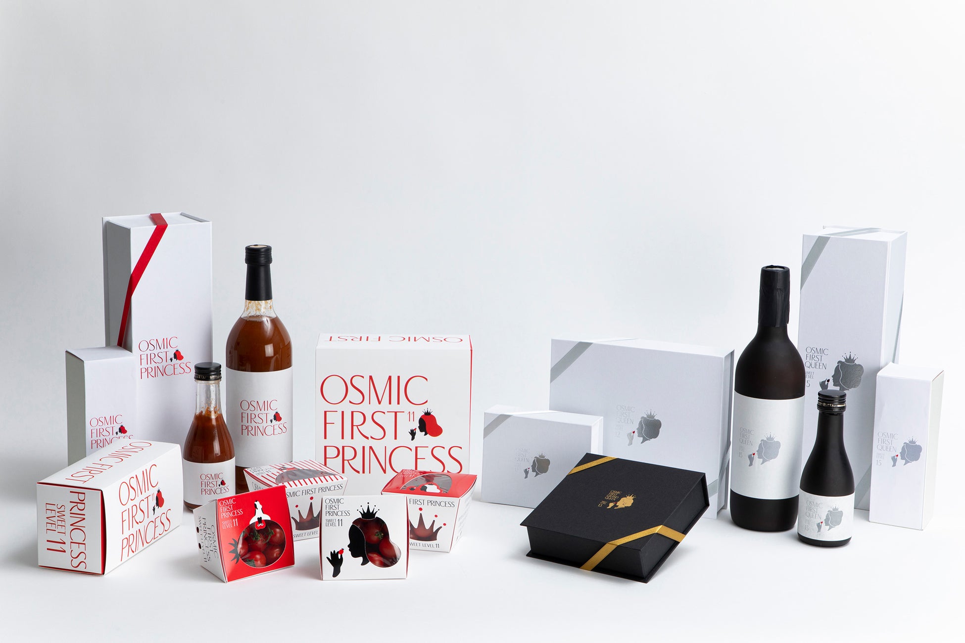 OSMICトマトはゼロから開発した土壌と栽培環境。そこで育てる贅沢なトマト。収穫後に1つ1つ糖度を測定し、11度以上を満たすものだけに許された特別なパッケージです。糖度11度のPRINCESS、糖度12度のQUEEN、そして0.1%の収穫率の糖度13度GRAND QUEENとラインナップ。またそのトマトと同等のものだけを煮詰めて作った最高峰のトマトジュースです。