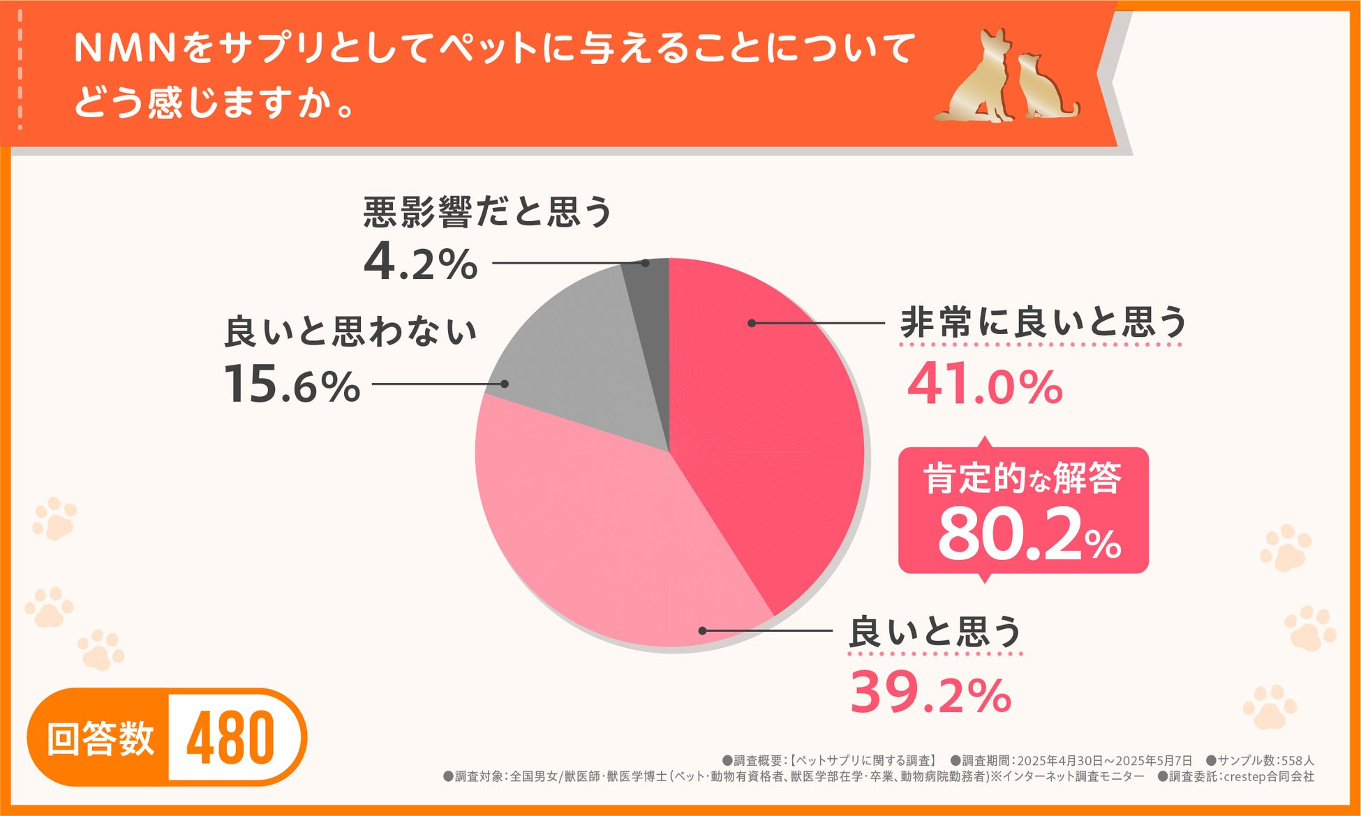 NMNをサプリメントとしてペットに与えることについては、「非常に良いと思う」(41.0%)、「良いと思う」(39.2%)を合わせて80.2%が肯定的に回答。一方で、「良いと思わない」(15.6%)、「悪影響だと思う」(4.2%)とする慎重派も見られましたが、全体として高評価が目立ちます。