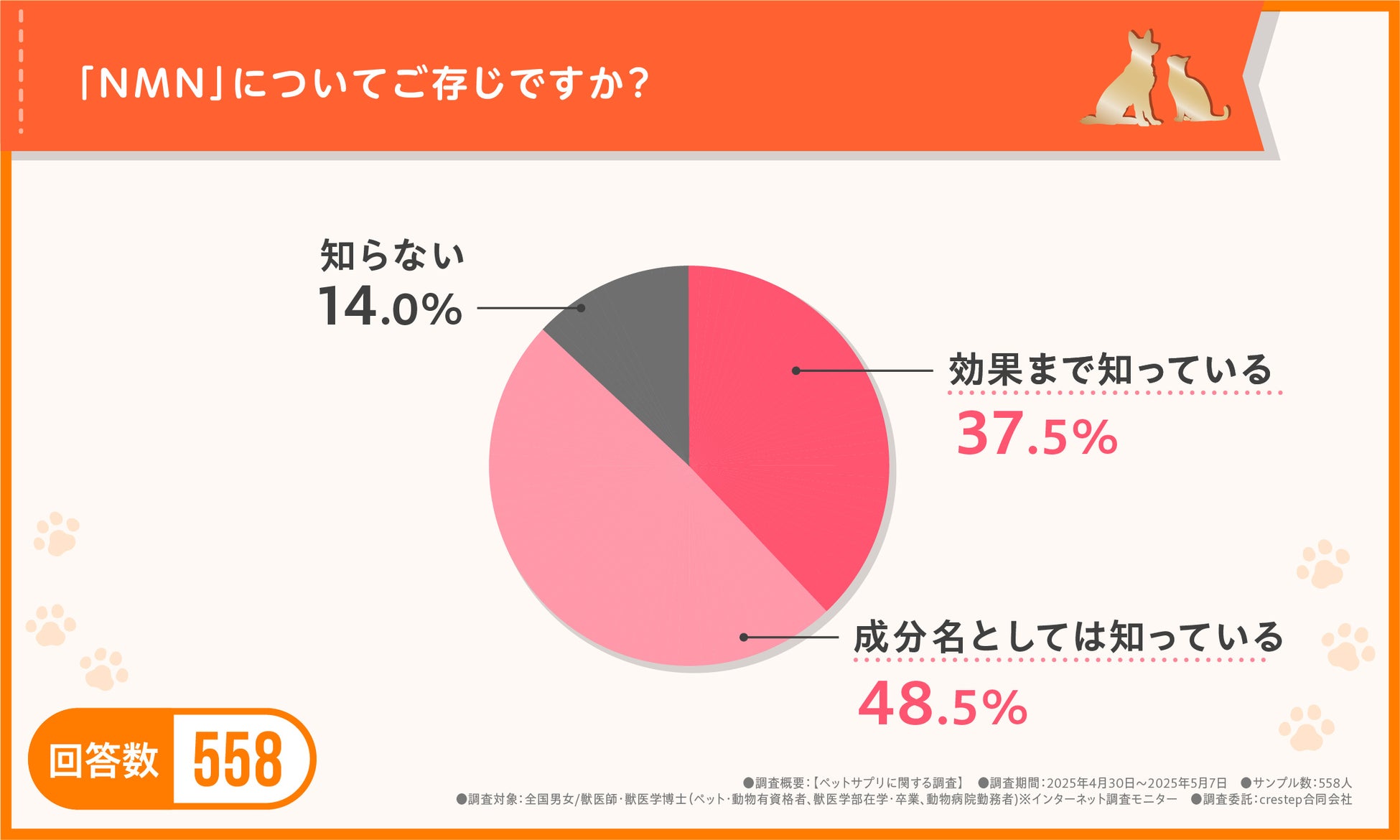 「NMNについてご存じですか?」という質問に対しては、「効果まで知っている」と答えた人が37.5%、「成分名としては知っている」が48.6%と、NMNの認知は8割以上に及びました。ペット分野でもNMNへの関心が高まりつつあることを示唆しています。