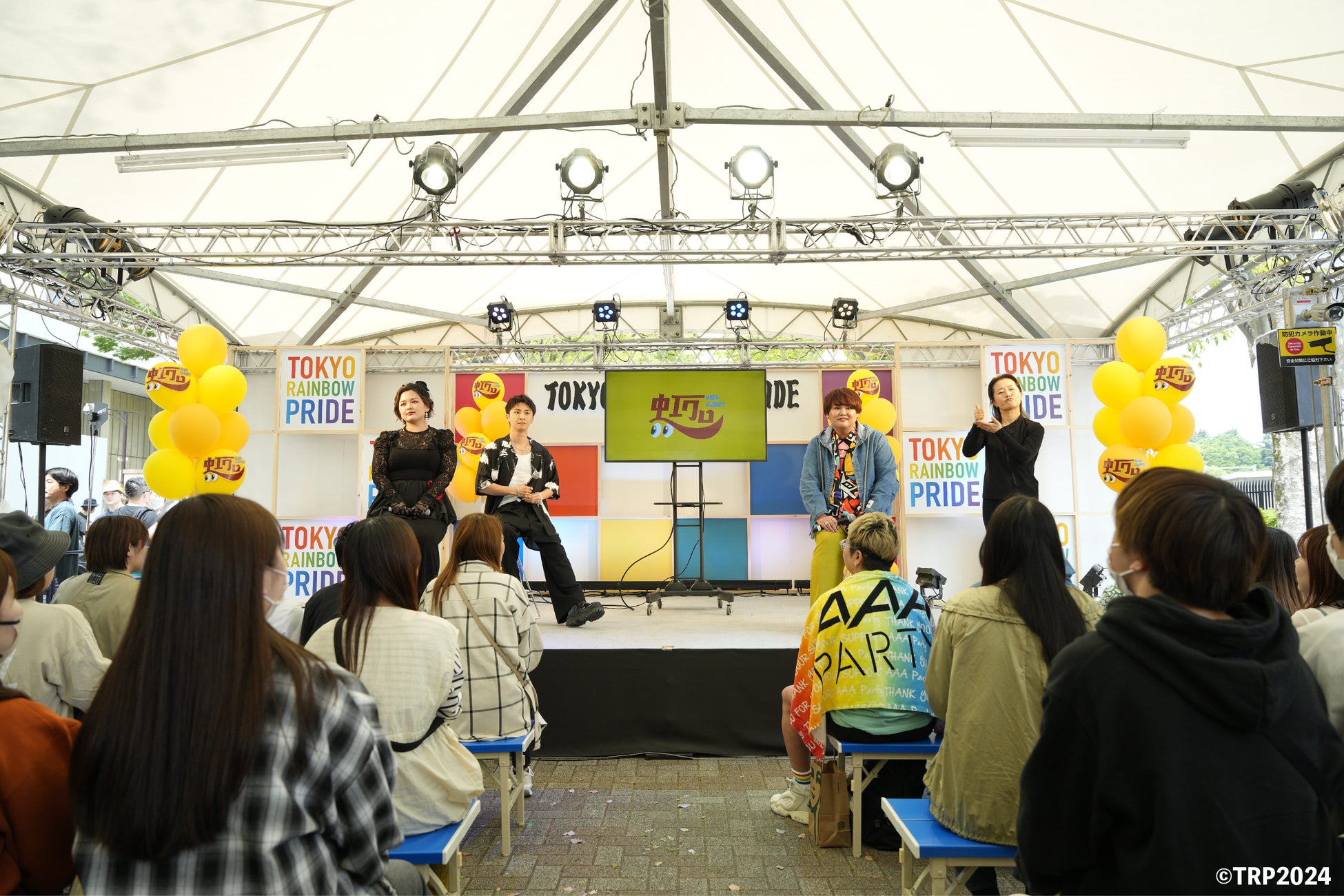 TRP2024最終日。会場は前日までと比べてさらに盛り上がりを見せています。会場内(代々木公園けやき並木)に登場したレインボーステージはトークショーからスタート。「自分らしいファッション」について與真司郎さんをゲストに迎えて実施しました。性に揺らいだり、自分らしくありたいと感じたり、LGBTQ+の人を応援したいと思うユース世代に向けて與さんは素直な思いを話してくれました。そのほか、手話夫婦漫才や、「LGBTQ+と仕事」についてのインフルエンサートークも実施し、年代問わず様々な人がステージコンテンツを楽しんでいました。