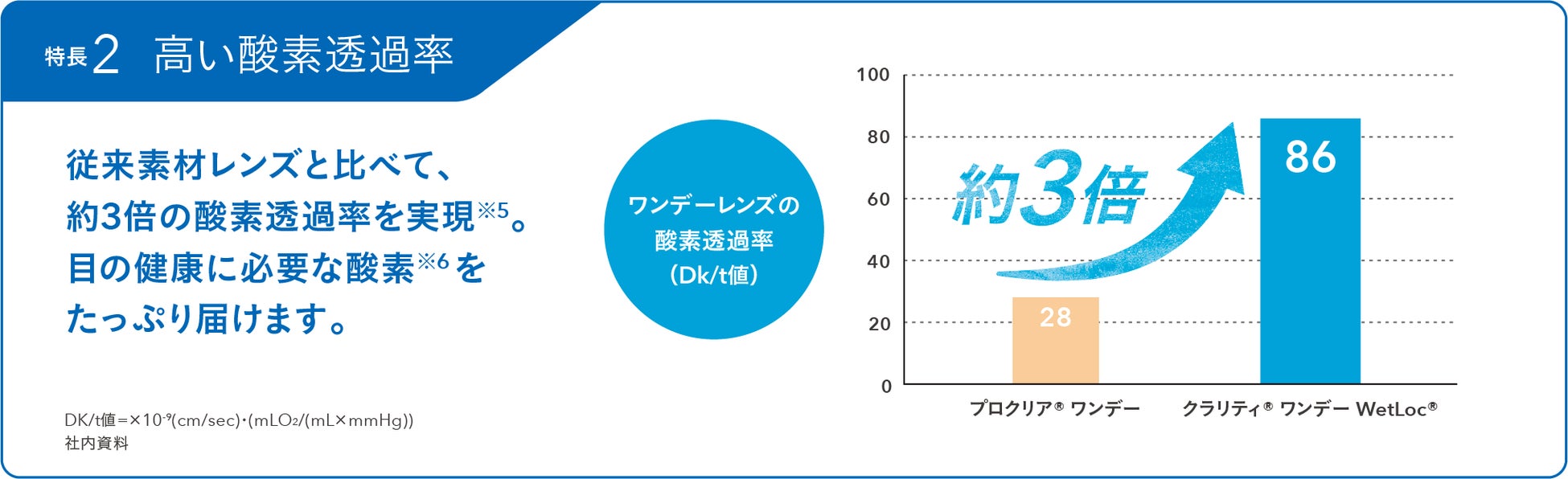 ※5 クラリティ® ワンデー WetLoc® Dk/t=86とプロクリア® ワンデー Dk/t=28(-3.00Dの場合、社内資料)の比較