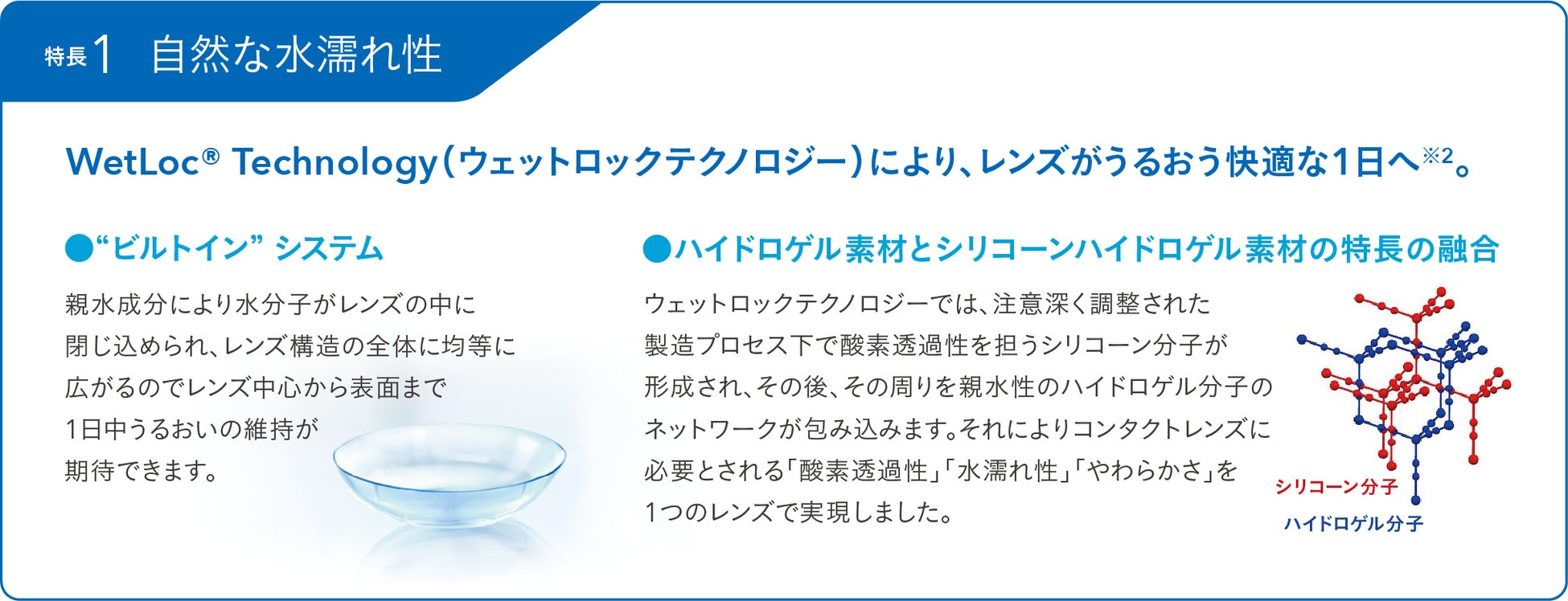 ※1 高性能とは、当社従来素材レンズと比較して、コンタクトレンズに必要なやわらかさとうるおい、独自のエッジデザインにより快適性を高め、さらに角膜へ十分な酸素を届ける酸素透過性を持つことを指します。