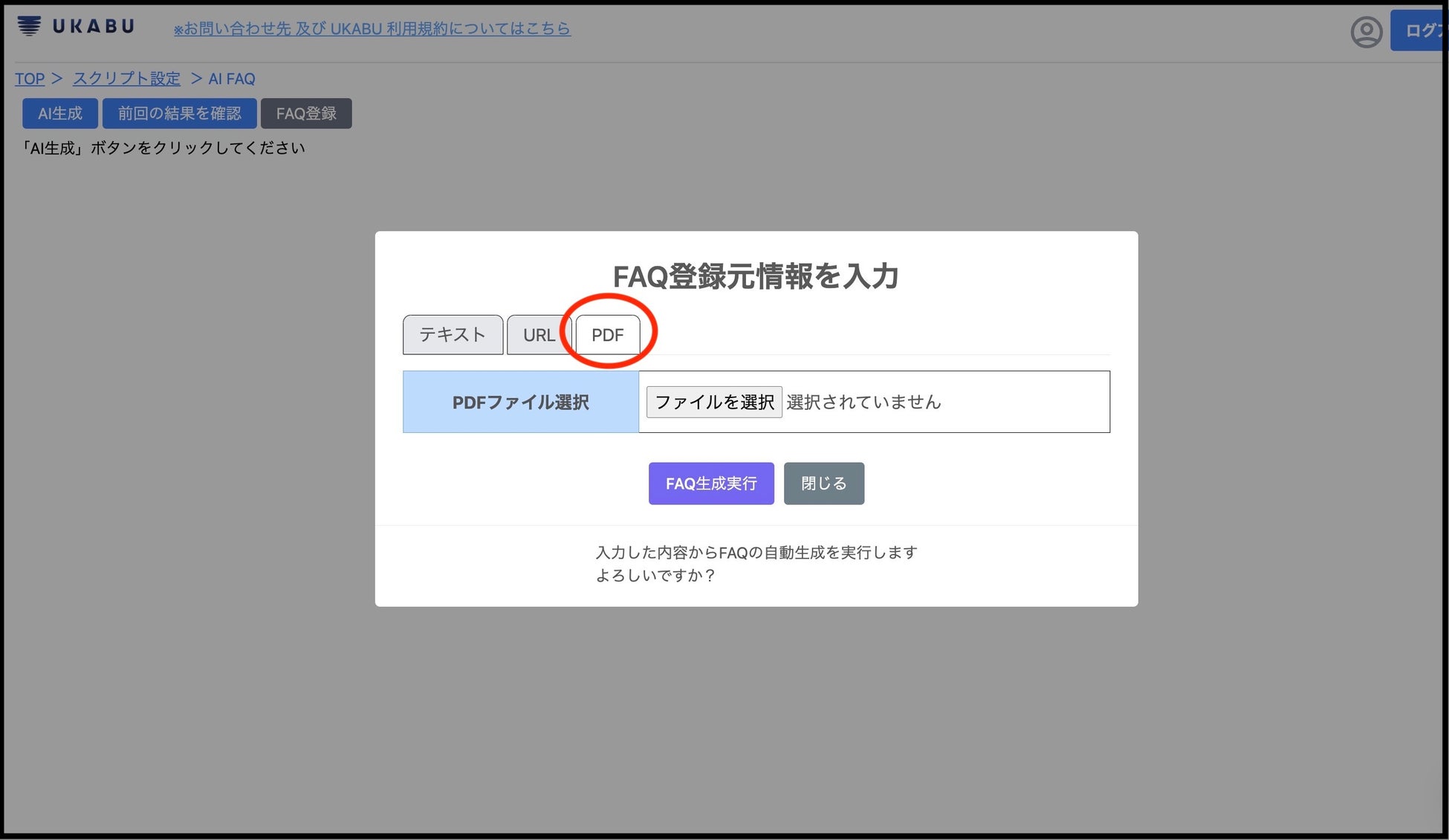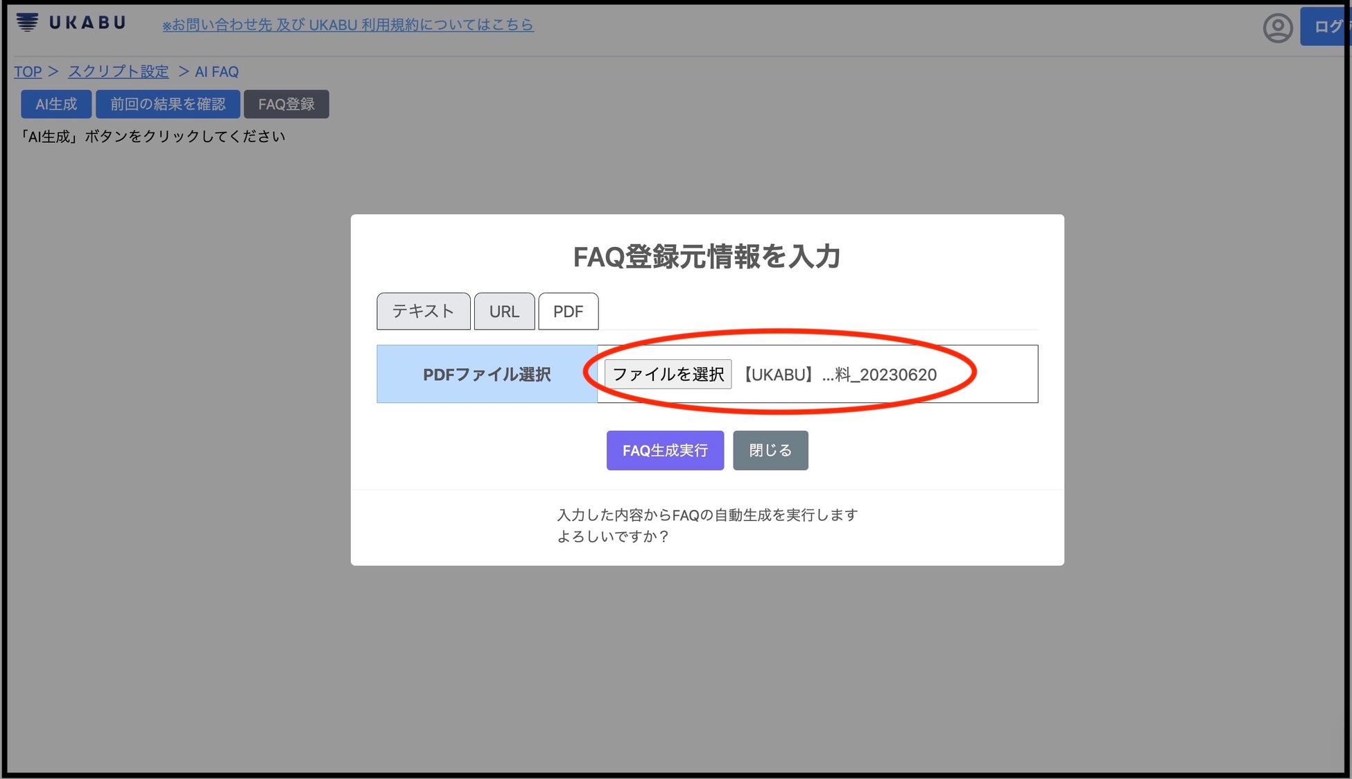 UKABU AI FAQ 設定画面に、「テキスト」「URL」に加えて、「PDFファイル」取り込みタブより、PC上のPDFファイルを選択すると、質問タイトルと回答本文がセットになったFAQ候補リストを自動生成します。