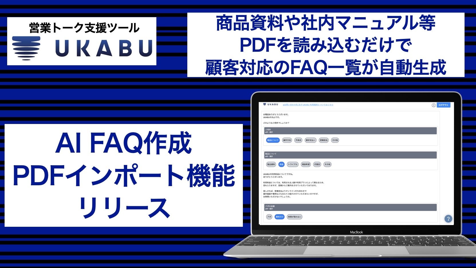 営業トーク支援ツールUKABUが「AI FAQ機能」にPDFインポート機能を追加リリース!PDFファイルを読み込ませるだけで、想定FAQパターンを一括作成!