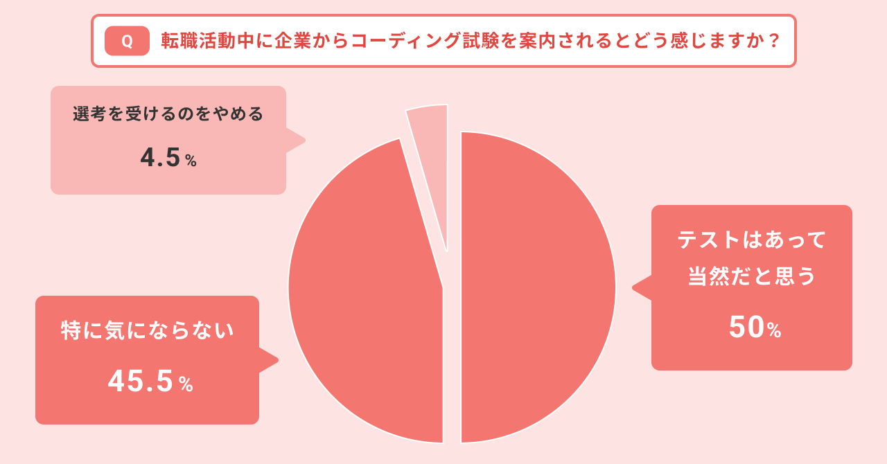 - 「コーディング試験を案内されたらどう思うか」に対して95.5%の人が「あって当然」「気にならない」と回答