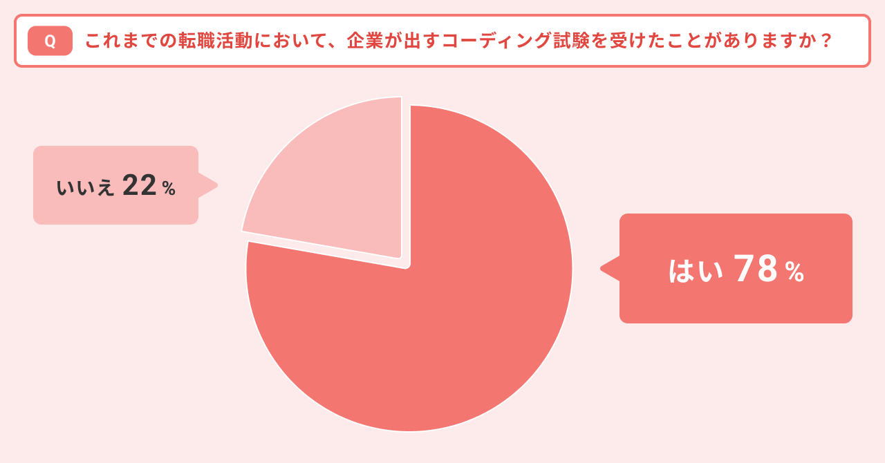 「これまでの転職活動において、企業が出すコーディング試験を受けたことがありますか?」という設問に対し、78%が「はい」と回答。多くのWebエンジニアがコーディング試験を受けた経験があるとわかりました。