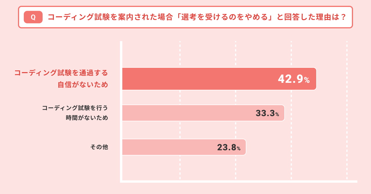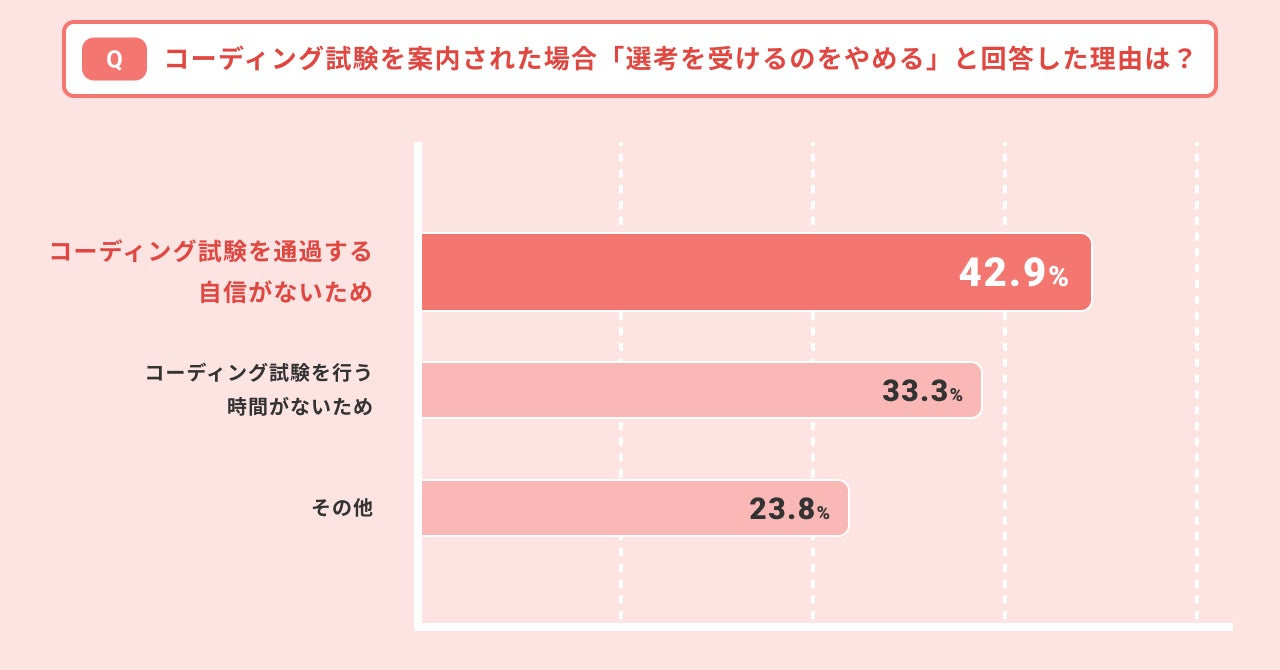 コーディング試験を案内された場合「選考を受けるのをやめる」と回答した人に対してその理由を聞くと「コーディング試験を通過する自信がないため」が42.9%、「コーディング試験を行う時間がないため」が33.3%という結果となりました。ごく少数ですが自身の技術力への不安から試験に消極的な人がいることがわかります。
