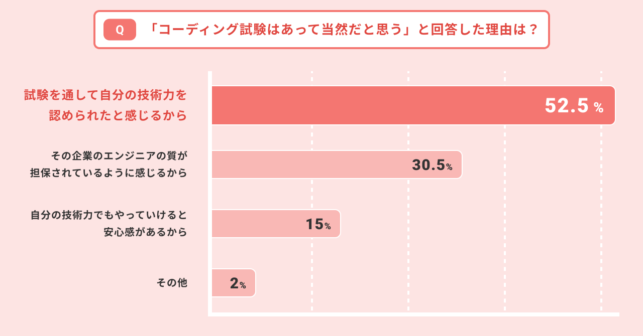 「コーディング試験はあって当然だと思う」と回答した人に対してその理由を聞くと「試験を通して自分の技術力を認められたと感じるから」という回答が52.5%と半数を超えました。次いで「その企業のエンジニアの質が担保されているように感じるから」が30.5%、「自分の技術力でもやっていけると安心感があるから」が15%という結果に。多くのWebエンジニアが、コーディング試験を自身の技術力を担保する材料だと捉えていることがわかりました。