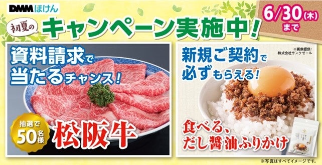 本キャンペーン期間中、①「DMMほけん」の〈死亡保険〉、〈引受基準緩和型死亡保険〉の資料を請求された方の中から抽選で50名様に【松阪牛ギフト券(税込10,000円)】を、さらに、②「DMMほけん」の〈死亡保険〉、〈引受基準緩和型死亡保険〉に新規にご契約いただいた方には、もれなく【食べる、だし醤油ふりかけ 50g】をプレゼントします。