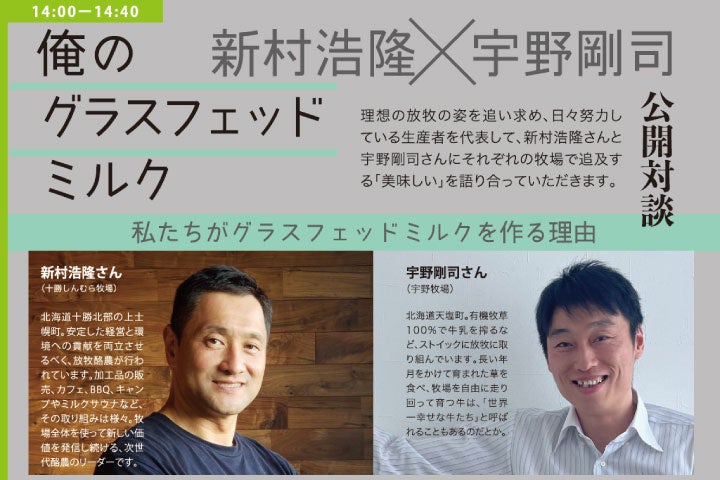 理想の放牧の姿を追い求め、日々努力している生産者を代表して、新村浩隆さんと宇野剛司さんにそれぞれの牧場で追及する「美味しい」を語り合っていただきます。
