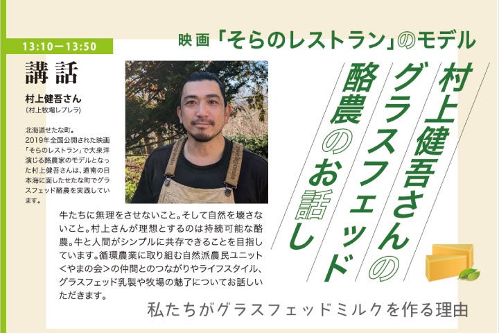 牛たちに無理をさせないこと。そして自然を壊さないこと。村上さんが理想とするのは持続可能な酪農。牛と人間がシンプルに共存できることを目指しています。循環農業に取り組む自然派農民ユニット<やまの会>の仲間とのつながりやライフスタイル、グラスフェッド乳製や牧場の魅力についてお話しいただきます。