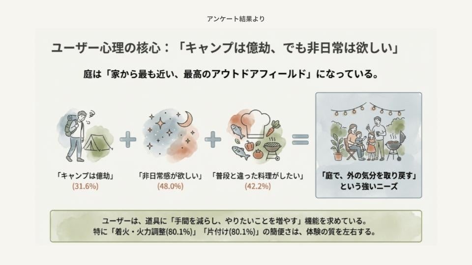 一方で、「キャンプは準備が大変だが、非日常は取り入れたい」という声も多く、庭は負担なく非日常を取り入れられる“日常と非日常のあわい”として支持されていることが明らかになりました。