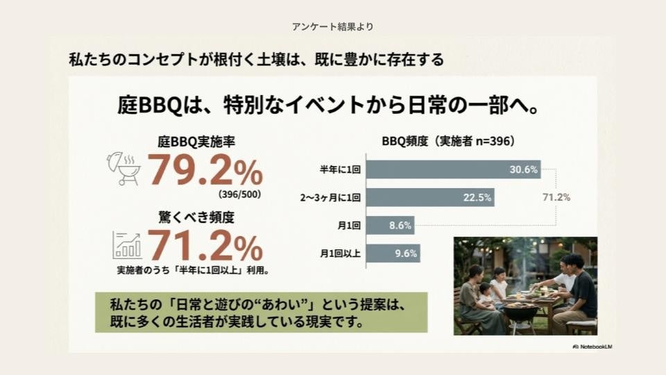 調査の結果、79.2%が「過去12か月間に庭でBBQをしたことがある」と回答し、そのうち71.2%が「半年に1回以上」実施していることが分かりました。庭でのBBQは特別なイベントではなく、すでに日常の延長として楽しまれている実態が見えてきました。