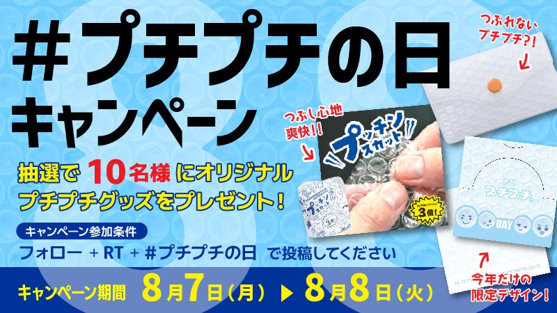 8月7日(月)~8月8日(火)に公式アカウントを「フォロー」+該当ツイートを「リツイート」+「#プチプチの日」でツイートしてご参加ください。10名様にオリジナルプチプチグッズ詰め合わせをプレゼント!