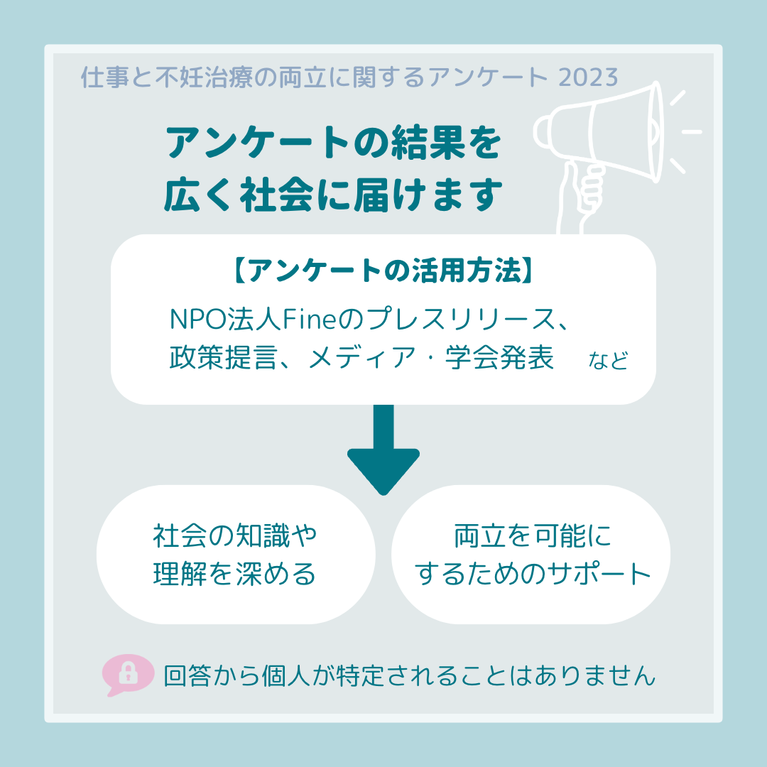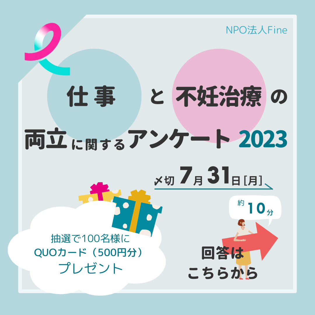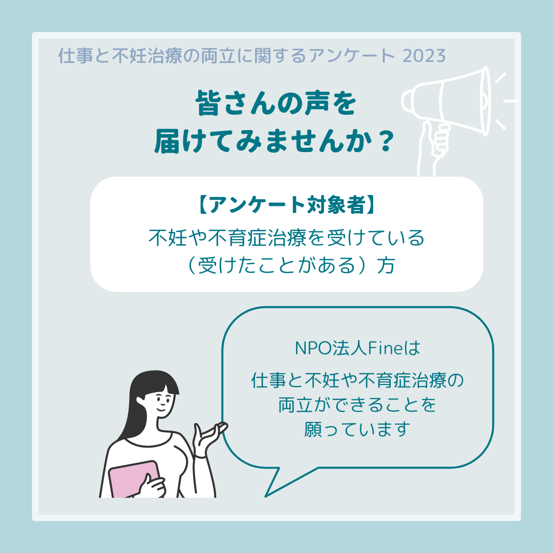 不妊治療患者をはじめ不妊・不育で悩む人をサポートする、セルフサポートグループ「NPO 法人 Fine (ファイン、以下、当法人)」は、2023年6月1日から7月31日まで、「仕事と不妊治療の両立に関するアンケート2023」を実施します。当事者の生の声を広く集め、不妊治療の保険適用がどのように当事者の生活に影響したのかを可視化することを目的としています。