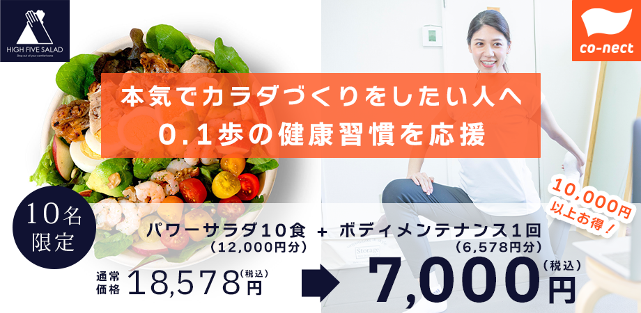 肩こり腰痛等の不調改善から、より日常生活が快適になるための疲れにくいカラダ作りまでをサポートする「ボディメンテナンス」を提供する「co-nect」(運営会社:株式会社co-nect、 東京都新宿区、代表取締役:中山友貴)は、日本初のパワーサラダ専門店「HIGH FIVE SALAD」(運営会社:株式会社ハイファイブ、東京都千代田区、代表取締役:水野裕嗣)と提携し、10名様限定でHIGH FIVE SALADのパワーサラダ10食とco-nectのボディメンテナンス1回が通常18,578円(税込)のところ、7,000円(税込)で提供する食×運動のコラボ企画が開催され、公開3時間で完売しました。