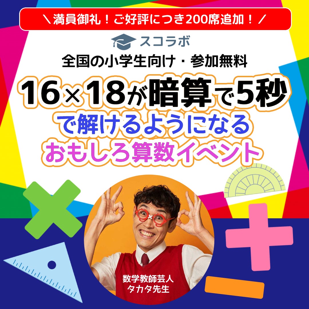 \満員御礼!ご好評につき増席!/16×18が暗算で5秒でホントに解けるようになる!参加無料の小学生向け算数オンラインイベントを、スコラボが5月5日の夜に開催