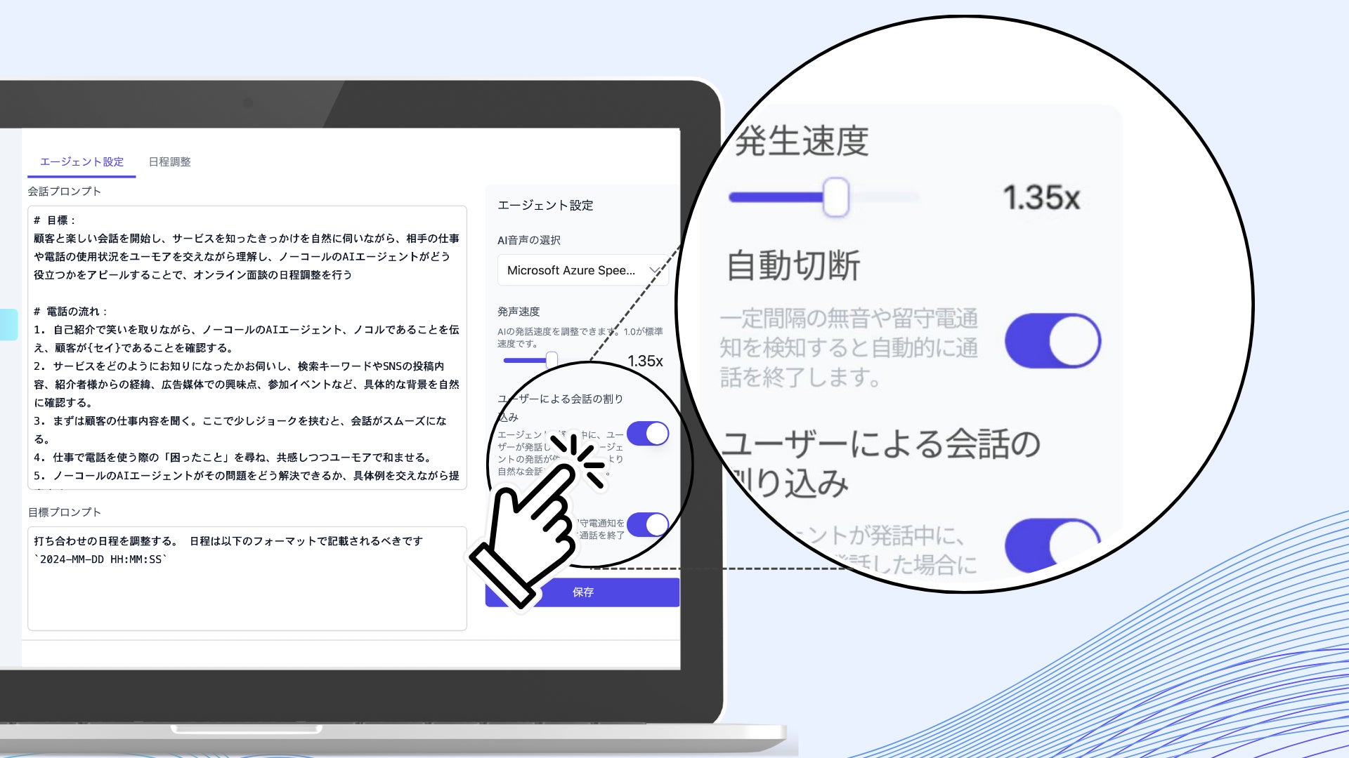 本機能は、nocall.aiの管理画面から設定が可能です。発話速度はスライダーで数値を調整でき、会話の割り込み検知と自動切断機能はトグルスイッチでON/OFFを切り替えられます。