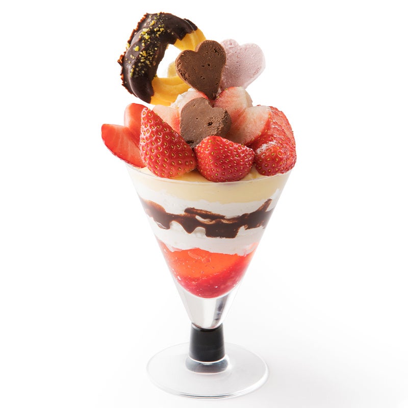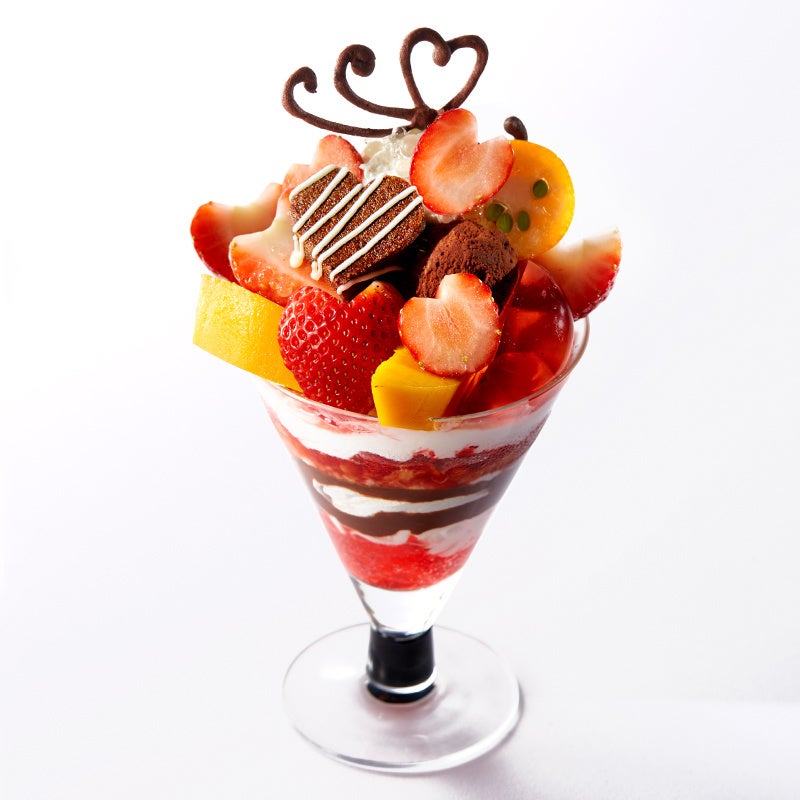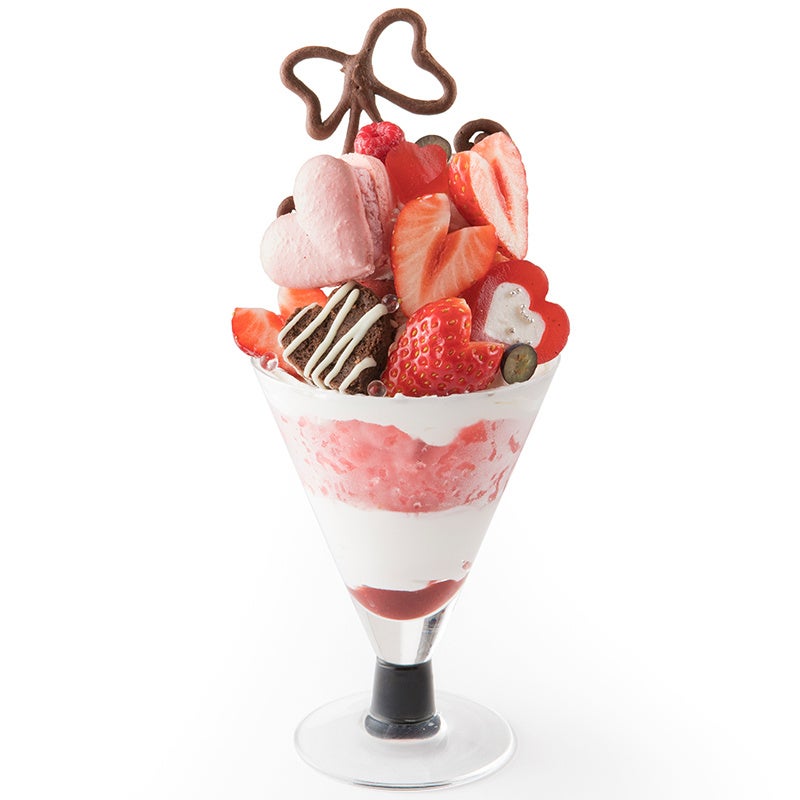 ハート型にカットされた苺とチョコをベースにしたパーツを組み合わせたバレンタインの期間限定メニューが、タカノフルーツパーラー全7店舗とパフェリオ本店にて、それぞれの店舗ごとに登場します。また新宿本店では「栃木県産とちあいか」で仕立てたバレンタイン限定コースメニューもご提供します。