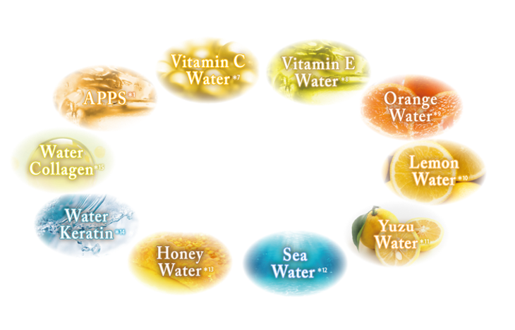 *1 パルミチン酸アスコルビルリン酸3Na(保湿) *2 アスコルビルグルコシド(保湿)、水溶性コラーゲン(補修) *3 加水分解ハチミツタンパク(保湿・補修)、加水分解ケラチン(羊毛)、水溶性コラーゲン(全て補修) *4 オレンジ果実エキス、レモン果実エキス、ユズ果実エキス、パルミチン酸アスコルビルリン酸3Na、3-O-エチルアスコルビン酸、トコフェリルリン酸Na、海水(全て保湿)、加水分解ハチミツタンパク(保湿・補修) *5 パルミチン酸アスコルビルリン酸3Na、3-O-エチルアスコルビン酸、アスコルビルグルコシド(全て保湿) *6 オレンジ果実エキス、レモン果実エキス、ユズ果実エキス、パルミチン酸アスコルビルリン酸3Na、3-O-エチルアスコルビン酸、トコフェリルリン酸Na、海水(全て保湿)、加水分解ハチミツタンパク(保湿・補修)、加水分解ケラチン(羊毛)、水溶性コラーゲン(全て補修) *7 3-O-エチルアスコルビン酸(保湿) *8. トコフェリルリン酸Na(保湿) *9 オレンジ果実エキス(保湿) *10 レモン果実エキス(保湿) *11 ユズ果実エキス(保湿) 12 海水(保湿) *13 加水分解ハチミツタンパク(保湿・補修) *14 加水分解ケラチン(羊毛)(補修)*15 水溶性コラーゲン(補修) *16 リン酸アスコルビルMg(保湿)