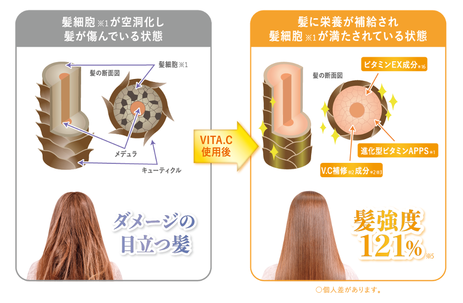 今回発売するVITA.Cシリーズは、90%以上補水+V.C補修※2成分*2※3で構成されており、栄養不足の髪細胞※1をV.C補修※2成分*2で集中補修する“新ウォータービタミン美容※4”がコンセプト。
