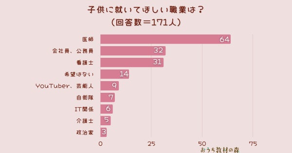 ARINA株式会社が運営する幼児、小学生の親御さん向けの教育メディア「おうち教材の森」(https://naki-blog.com/study/)は、日本全国の中学生以下のお子さんをお持ちの親御さんを対象に「子供に就いてほしい職業は?」とアンケート調査を実施しました。その結果を公表します。