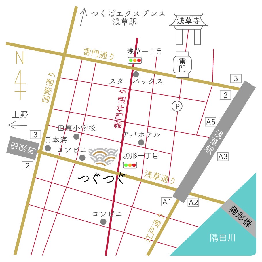 銀座線浅草駅から徒歩5分、浅草線浅草駅から徒歩3-4分、田原町駅から徒歩3分、つくばエクスプレス浅草駅からも徒歩圏内です。