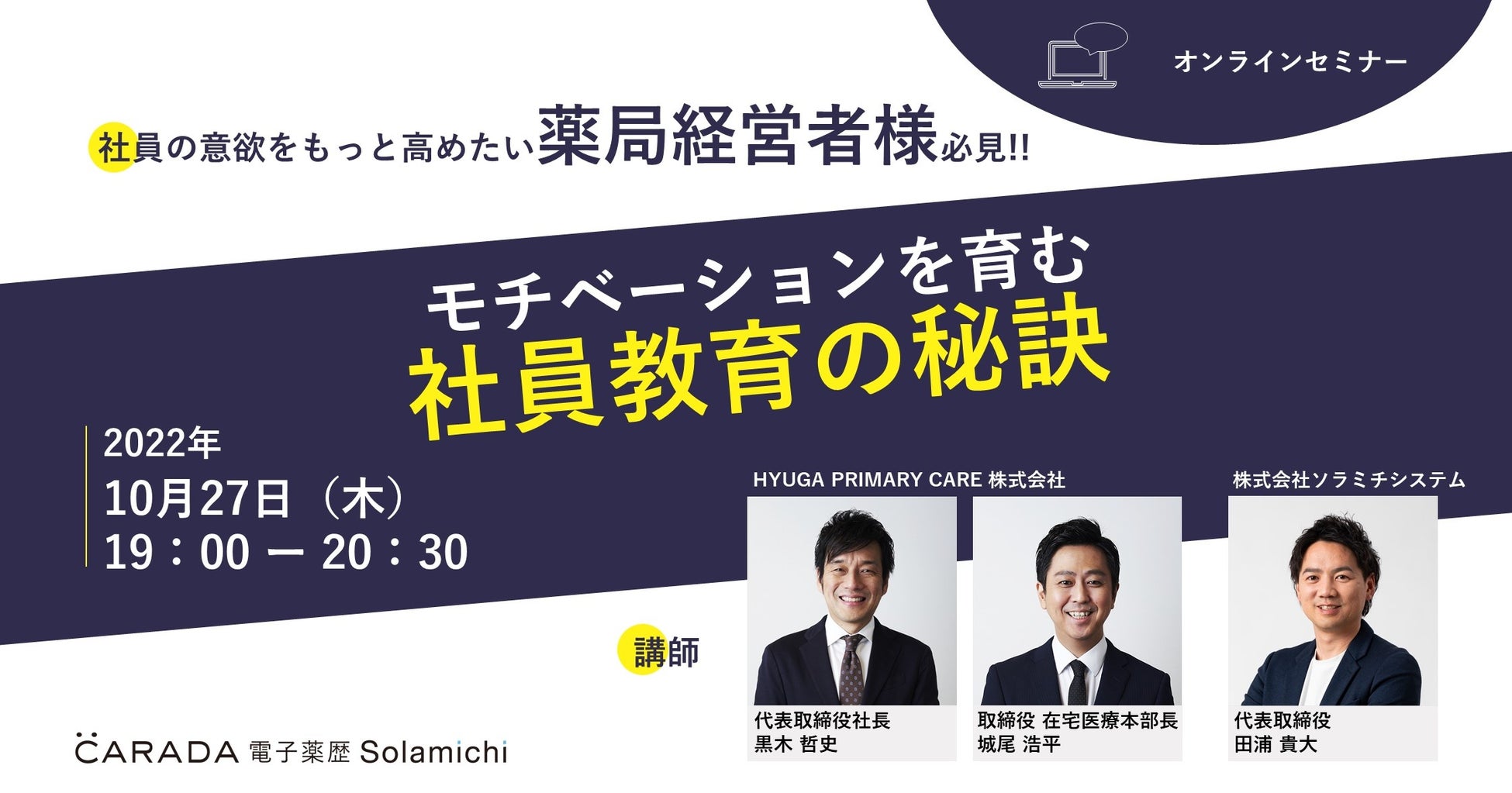 薬剤師による在宅訪問を実施している患者数が8,000名超※で、1店舗当たりの在宅訪問患者数200名以上の在宅支援実績を持つHYUGA PRIMARY CARE社と、在宅訪問を行っている薬剤師にも活用されているクラウド電子薬歴『CARADA 電子薬歴 Solamichi』を展開するソラミチシステムが、社員のモチベーションを育む「教育の秘訣」について、具体的な事例を交えながらトークセッションを行います。