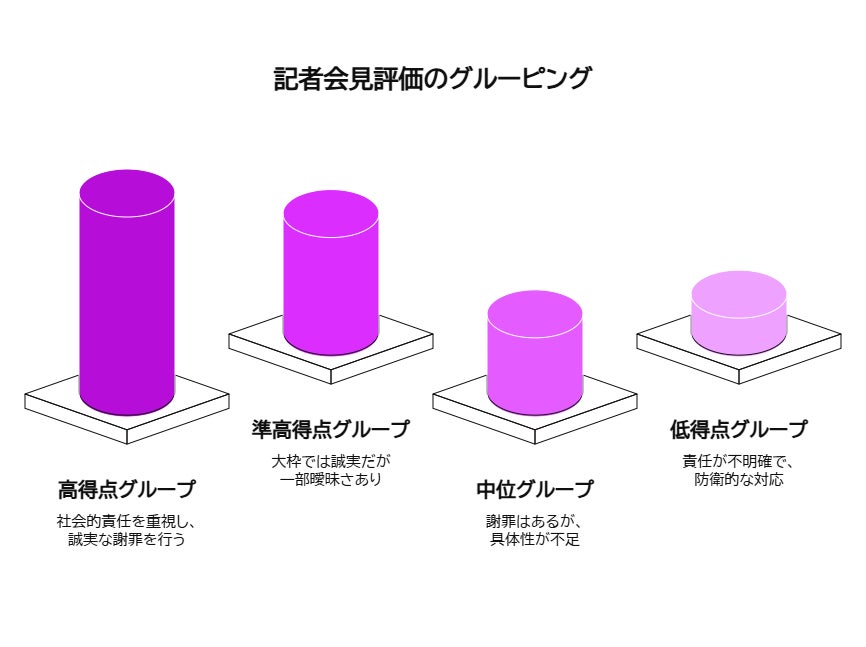 本レポートは公開されている不祥事会見の動画を、統一された指標に基づきAIを用いて評価したものであり、各企業の実態を断定するものではありません