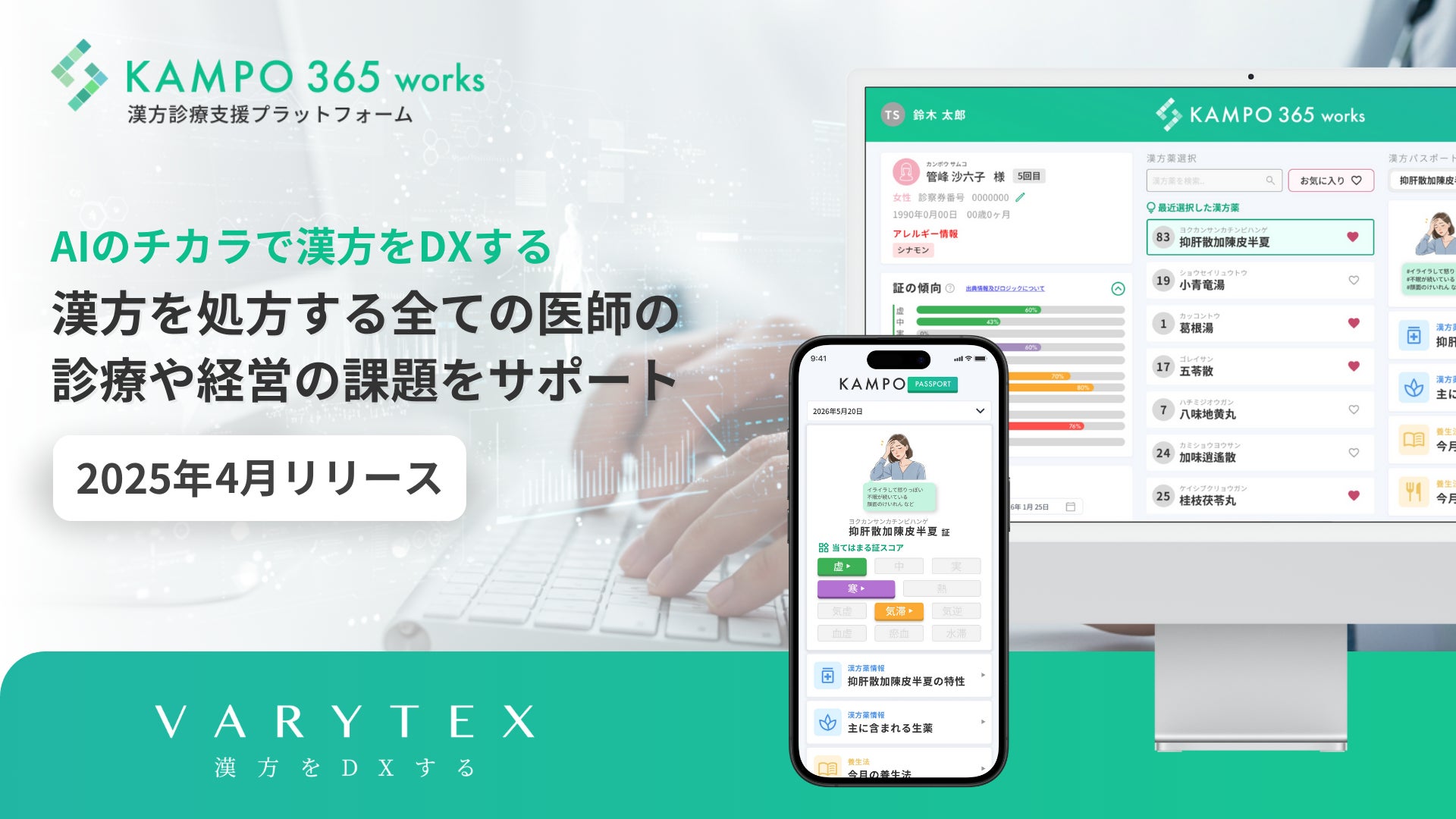 VARYTEX(ヴァリテックス)株式会社(本社:東京都港区、代表取締役:平野喜一郎)は、AIを搭載した漢方診療支援プラットフォーム「KAMPO 365 works」(非医療機器)の提供を2025年4月1日(火)より開始いたしました。既存の漢方診療支援機能に加え、医師と患者様とのエンゲージメントを強化する「漢方パスポート」機能、「LINE連携」機能、そして生活者向けの「漢方メディア連携」機能を整備。漢方診療における非効率性やコミュニケーション不足といった医師と患者様双方の課題を解決し、より良い漢方医療体験を提供します。