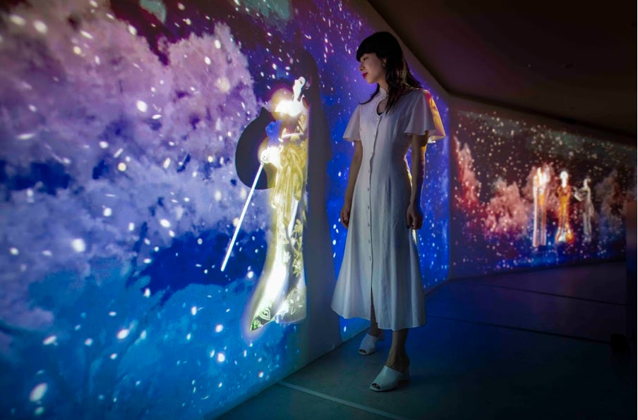 「カブキノヒカリ」は、歌舞伎演目を基に創出された、世界初のメディアアートによるインタラクティブな歌舞伎体験です。“ホログラム”に触れると現れる不思議な狐や、歩くたびに舞う桜の花びらなどの演出が施された、テクノロジーを用いた体験型展示です。歌舞伎の人気演目『義経千本桜』のうち、『鳥居前』、『道行初音旅』、『川連法眼館』の三幕をイメージしたメディアアートが、歌舞伎を構成する「音楽」、「踊り」、「芝居」と融合して、没入感あふれる、美しく奥深い光の空間へと誘います。