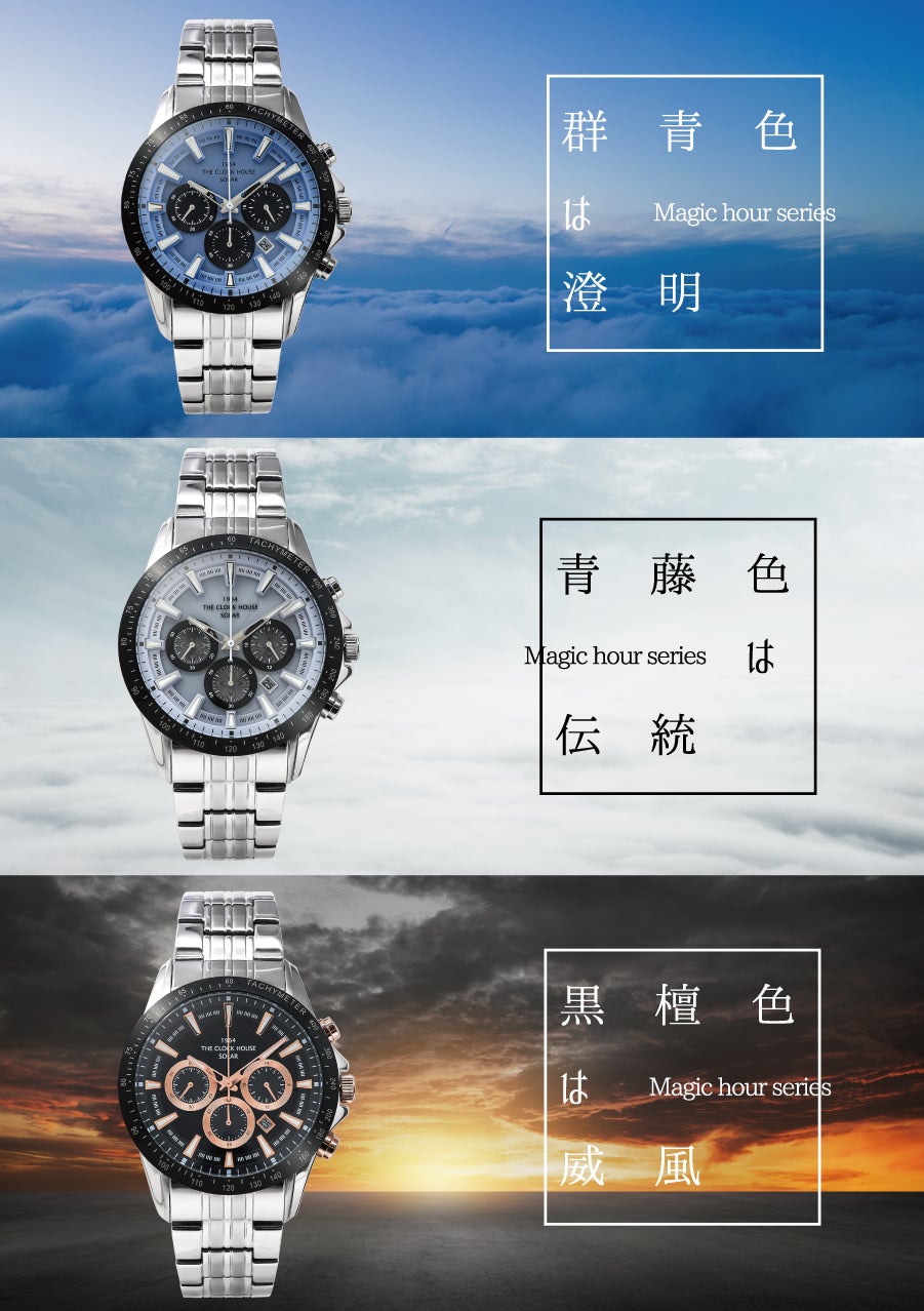 時計専門店として国内最大193店舗(リアル店舗185 オンラインストア8)を展開する株式会社ザ・クロックハウス(本社:東京都中央区、代表取締役社長:平野信之)はプライベートブランドウォッチ(以下、PBウォッチ)である「THE CLOCK HOUSE(ザ・クロックハウス)」よりマジックアワーの「空」をデザインコンセプトとした腕時計"Magic hour Series"を3月23日(土)にリアル店舗・オンラインストアで3モデル同時に発売します。https://www.theclockhouse.jp/pb/tips/202403newrelease