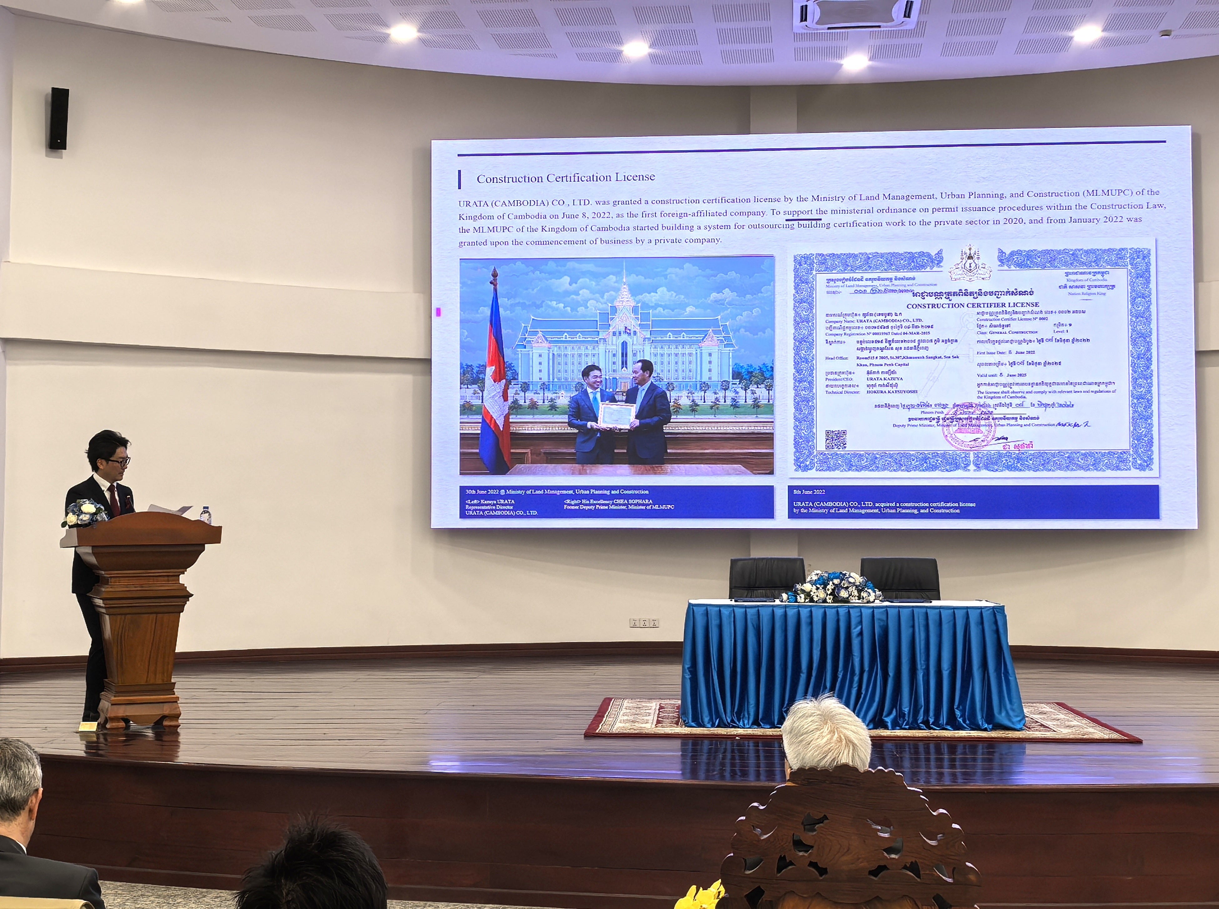 URATA (CAMBODIA) CO., LTD.は、2019年に公布された建設関連法およびその後の制度整備を受け、2022年6月8日、カンボジア王国国土管理・都市計画・建設省より、外資系企業として初めて建築認証機関ライセンスの発行を受けました。