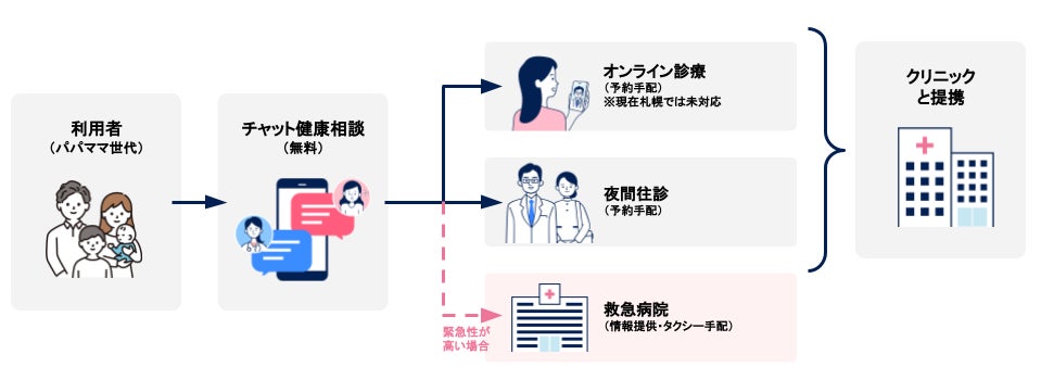 チャット健康相談をご利用頂く中で、「夜の時間帯に救急病院までの交通手段がない」等のユーザーの声があることを受け、キッズドクターアプリ内のチャット相談機能を通して、お近くの時間外対応の病院・クリニックのご紹介、並びに、札幌MKタクシーとの連携により、病院までの移動手段となるタクシーの配車連携を行うサービスのご提供を3月10日(木)より開始致します。