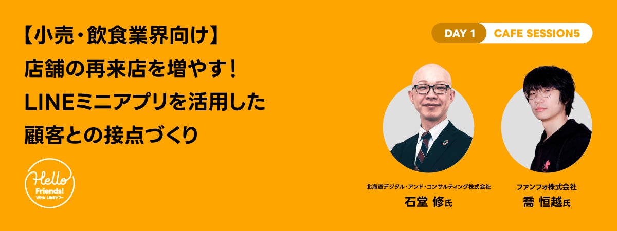 店舗をお持ちの方にとって、一度来ていただいたお客様に再度来店していただくことは、店舗の売上を高める上で非常に重要です。本セッションでは、小売業や飲食業の店舗領域において、LINEミニアプリを活用してどのようにお客様の再来店に繋げることができるのかを、北海道デジタル・アンド・コンサルティング株式会社の代表取締役社長である石堂氏とファンフォ株式会社のCEO喬が登壇し、事例を交えながらご紹介いたします。