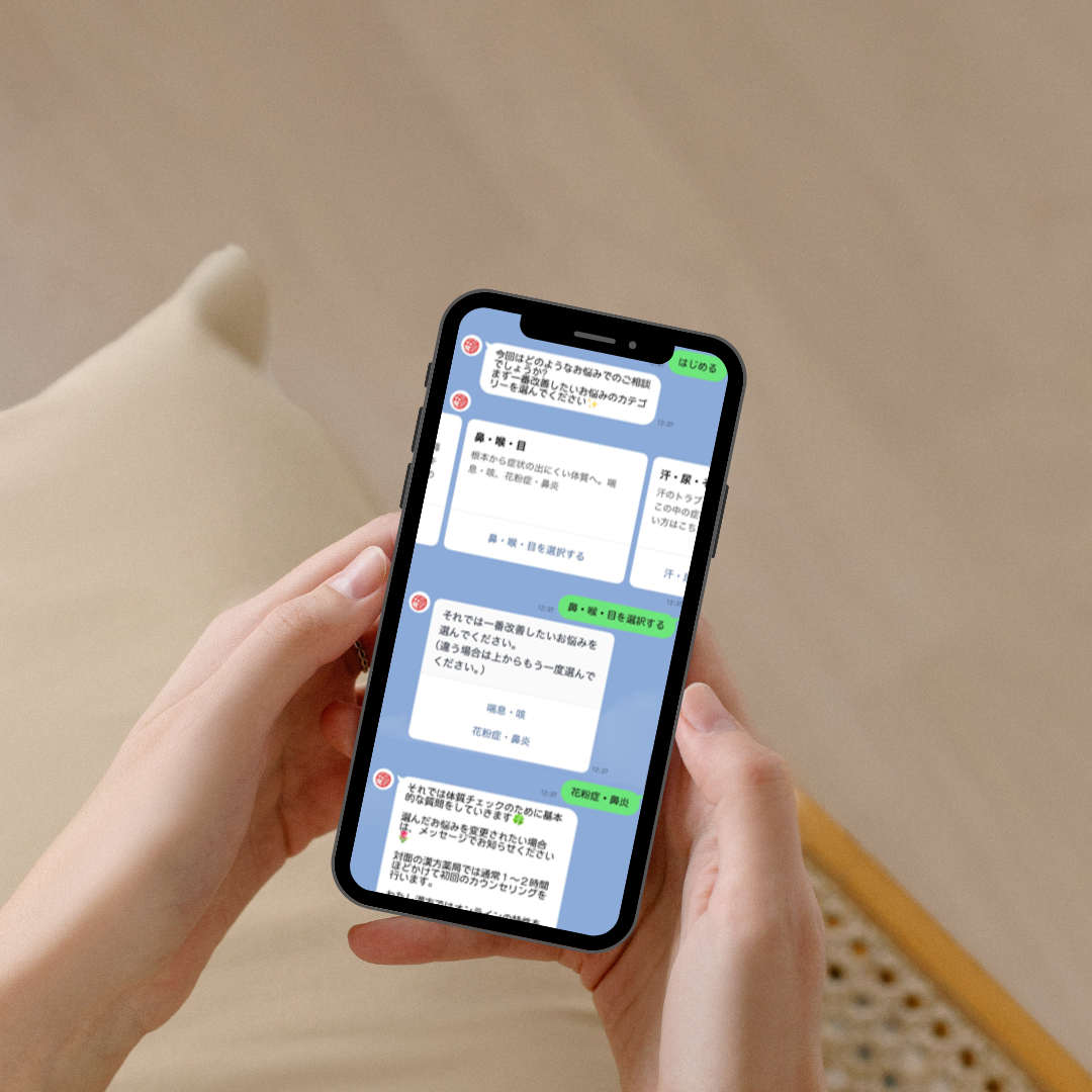 LINEを通じて専門家目線での体質チェック・改善プラン・あなたに合った生薬の提案を一度に受けることができます。漢方薬の服用とともに、自分専用のカルテを活用しながら日々の養生に取り組むことで、根本的な体質改善、そして“花粉症に負けない身体づくり”が期待できます。