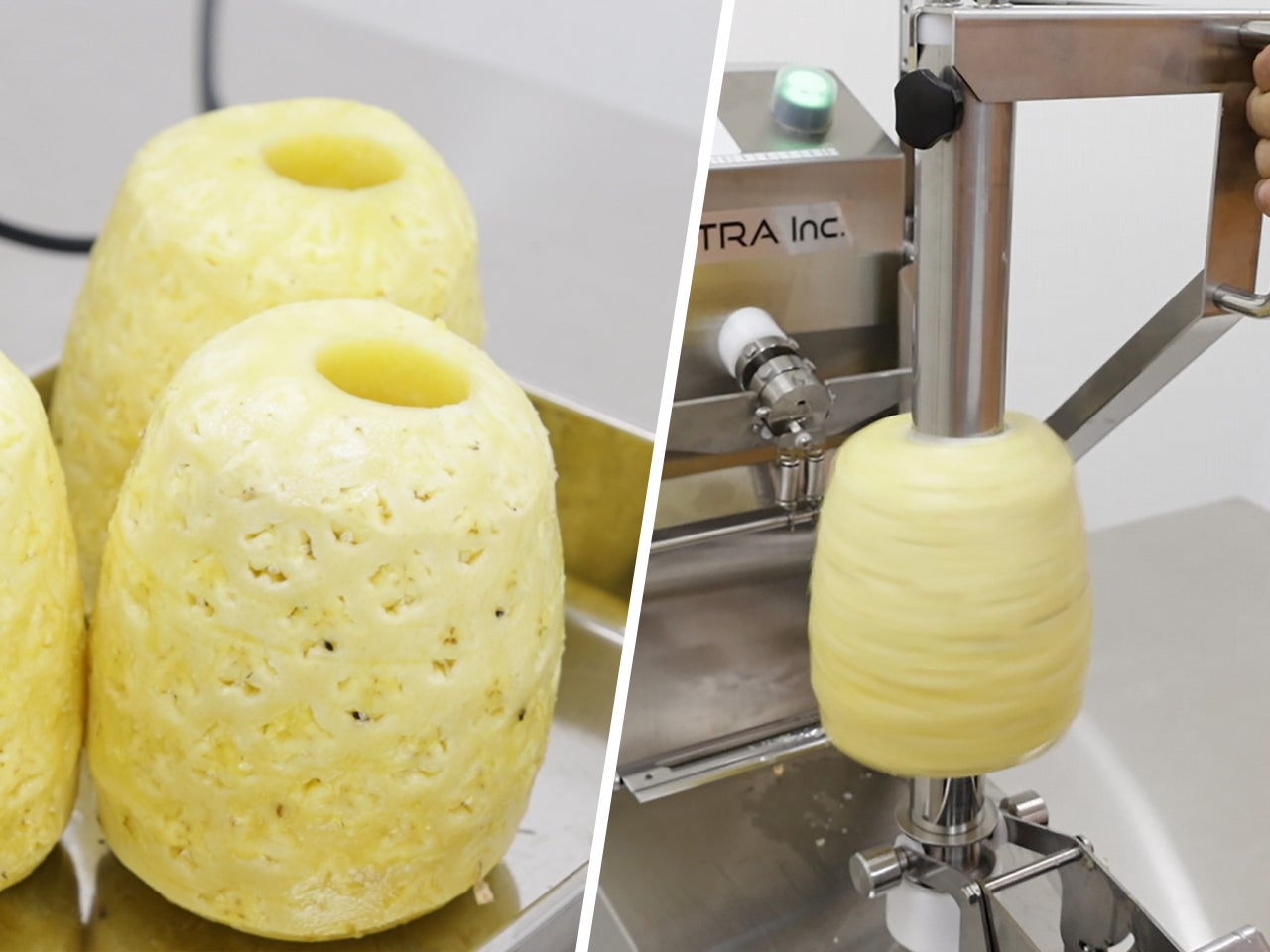 一般的な型抜きタイプのスライサーでは歩留まり率が35~40%程度であるのに対し、アストラ製皮むき機は60~65%の歩留まり率を実現しています。実際に、国内大手スーパー向けカットフルーツ工場では、導入後に生産量が従来比300%に増加した実績があります。