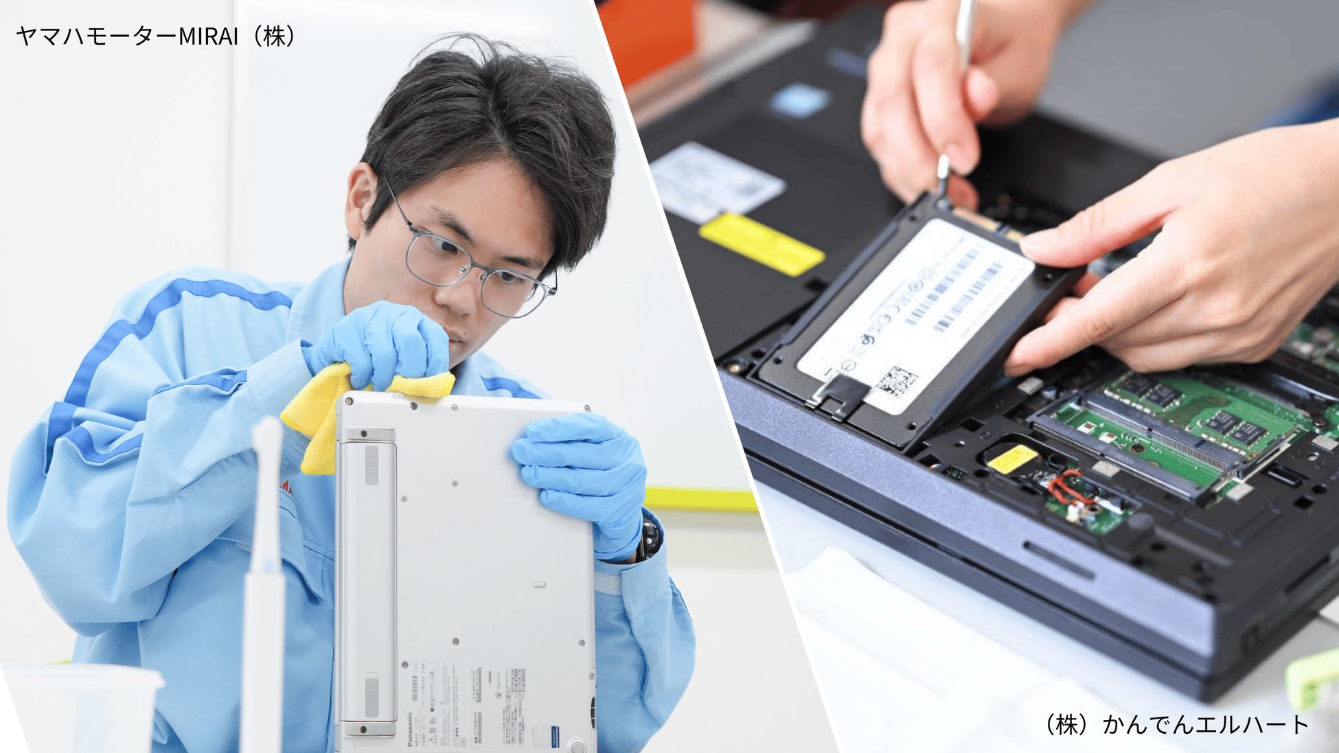 当社は障がい者雇用の拡大にも取り組んでおり、障がい者を多数雇用する大企業の特例子会社との連携を積極的に行っています。パソコンの再生作業は工夫すれば障がい者の方が能力を発揮しやすい業務です。現在、グループ会社である(株)かんでんエルハートや、ヤマハ発動機グループの特例子会社であるヤマハモーターMIRAI(株)など計5社と連携協定を結んでおり、自社で再生を手掛けるパソコンのうち約7割を特例子会社に委託しています。