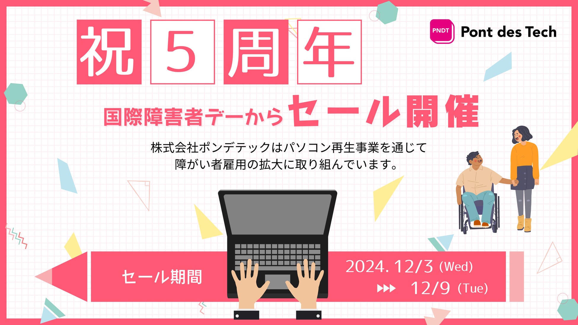 今年5周年を迎えた株式会社ポンデテックは、パソコン再生事業を通じて障がい者雇用の拡大に貢献してきました。自社ECサイトPC next では国際障害者デーの12月3日から7日間、記念セールを開催します。
