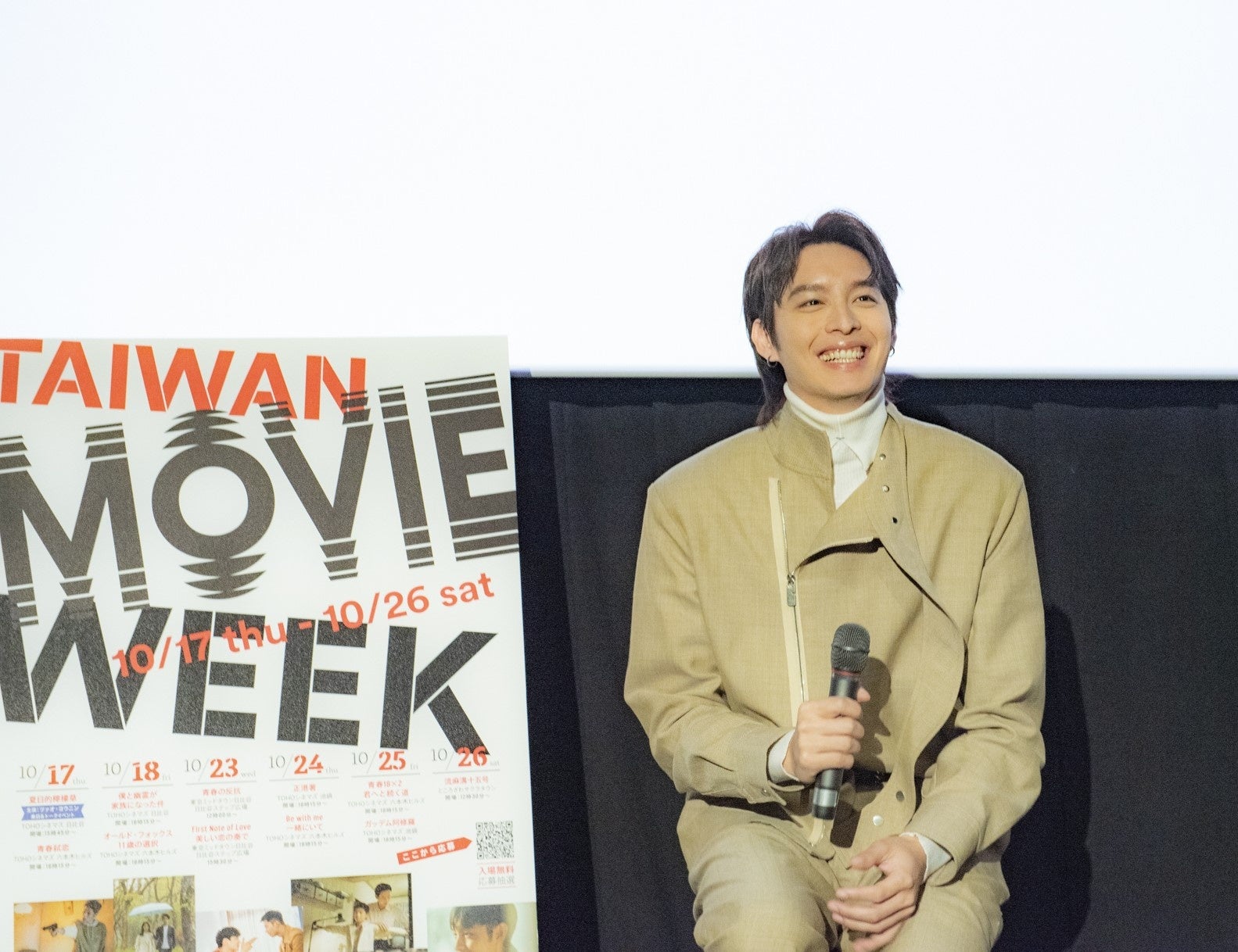 MCの呼び込みで、今年の「TAIWAN MOVIE WEEK」の特別ゲストである台湾の大人気俳優ツァオ・ヨウニンが笑顔で登壇すると、満席の会場は大きな拍手で包まれた。まずは「こんにちは、ツァオ・ヨウニンです。お久しぶりです」と日本語で挨拶、この来日を待ちわびていた日本のファンで満員の会場を大いに沸かせた。